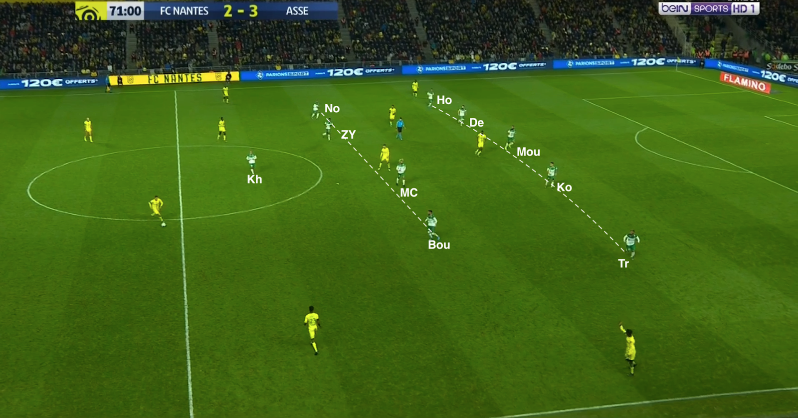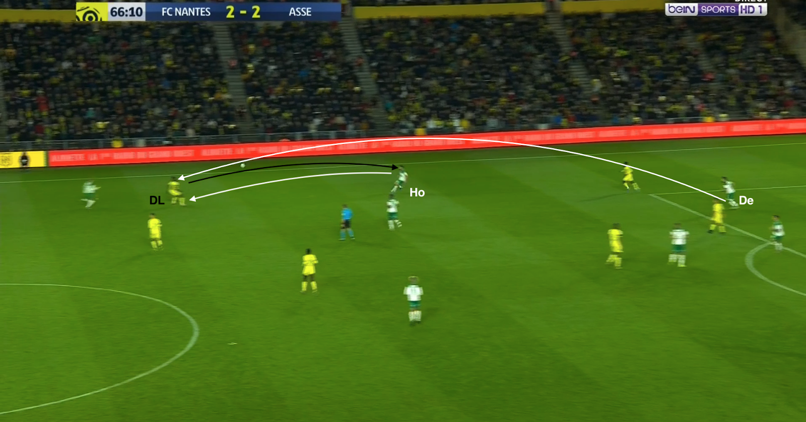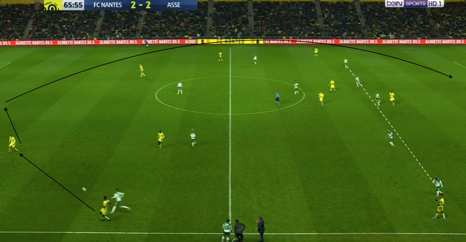 Debuchy dégage de la tête, le ballon est récupéré par un milieu, qui change immédiatement de côté, où la paire nantaise est bien excentrée. Les Stéphanois (en 5-4-1) coulissent bien...