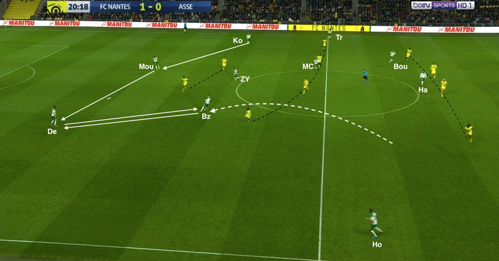 Il joue avec un milieu, Youssouf se trouve dans la zone, Honorat sort sur lui et toute la défense des Verts coulisse pour couvrir de ce côté. Moukoudi s'impose quand l'avant-centre est recherché et les Stéphanois récupèrent le ballon. Youssouf lance immédiatement Bouanga en profondeur...