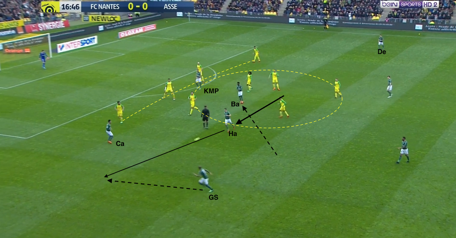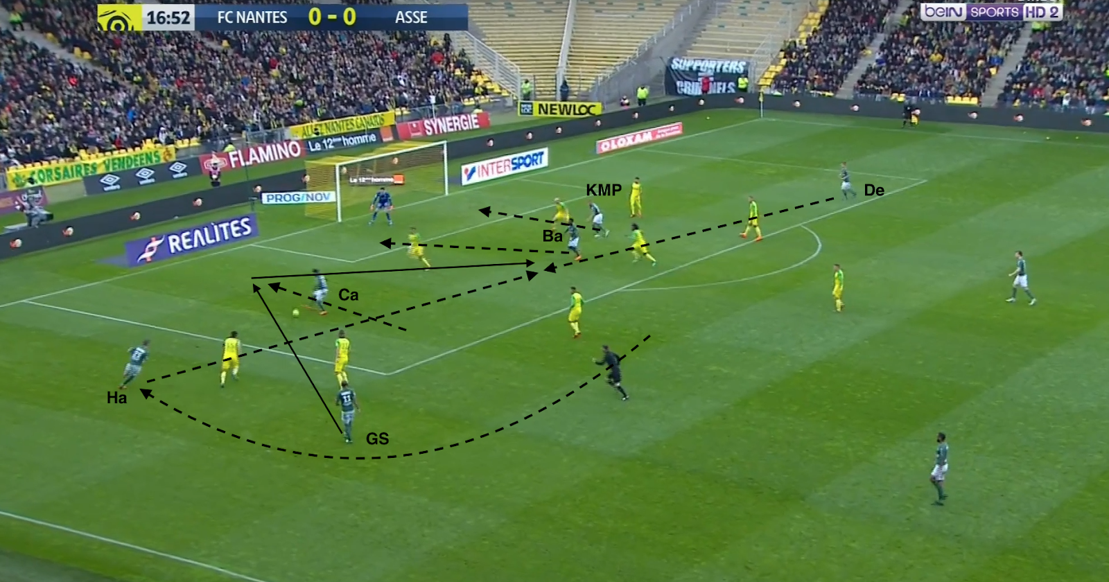 Ce n'était pas un contre proprement-dit, comme dans le premier exemple, mais les passes verticales et cette projection rapide vers l'avant permettent de vite traverser le bloc adverse et peuvent en donner l'impression. Ces passes verticales sont possibles grâce aux bons appels que les joueurs de l'ASSE ont fait dans tous les sens, comme ça devient évident lors d'un autre exemple, 10 minutes plus tôt :