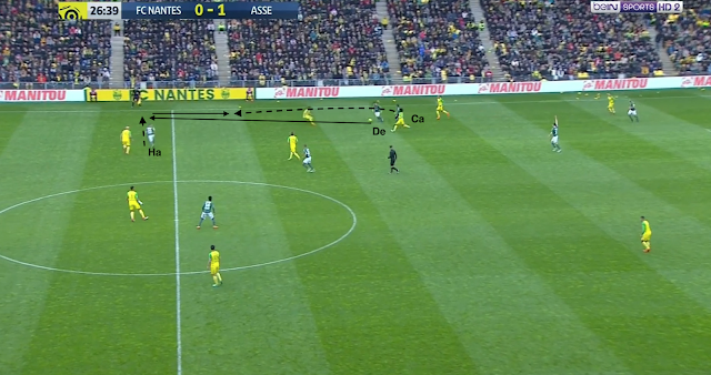 Il ne faut pas croire qu'à chaque fois que les Stéphanois récupéraient le ballon, ils se projetaient rapidement en contre. Parfois ils préféraient temporiser, comme dans cet exemple 20 minutes plus tôt, qui part d'un centre nantais de la gauche :