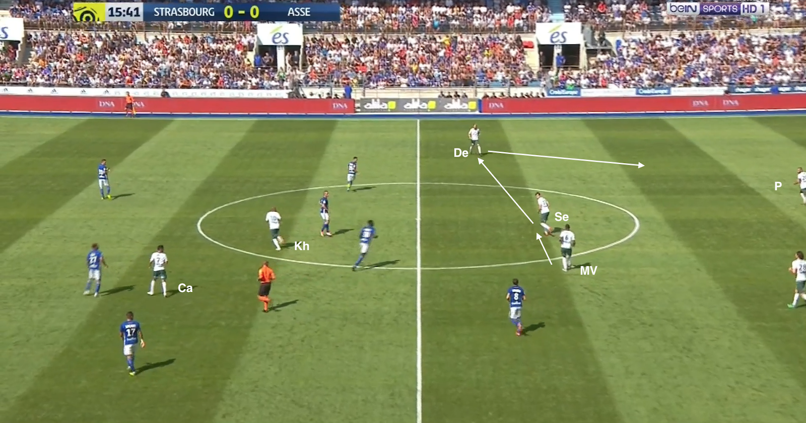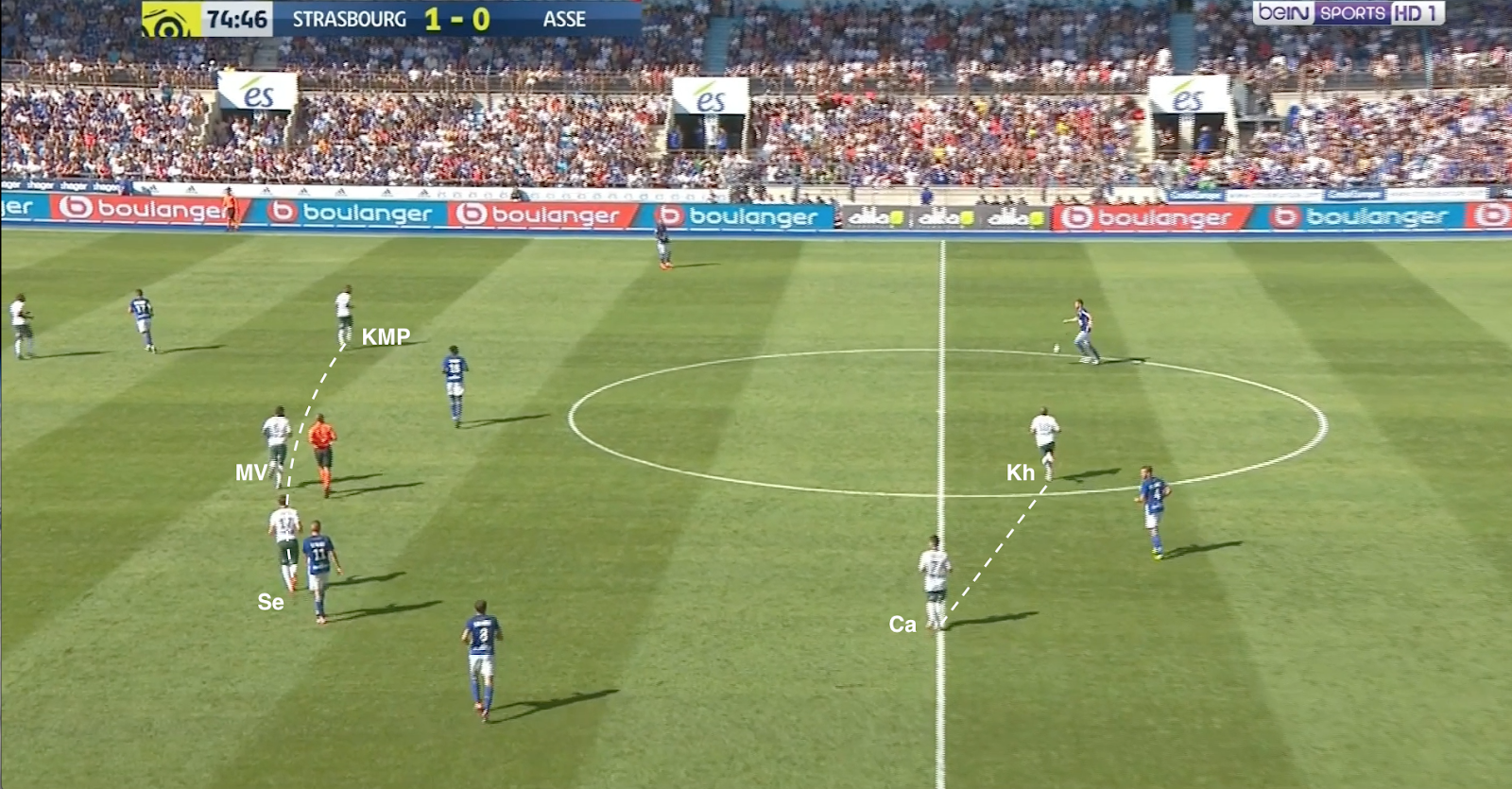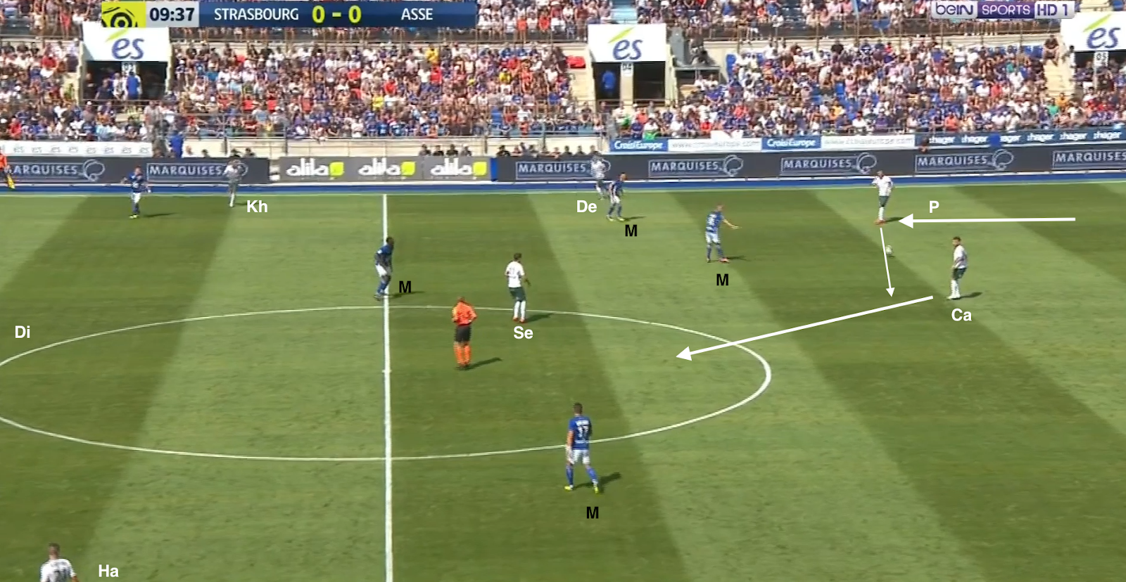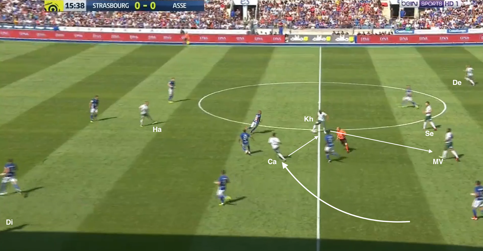 ... avant de le redonner à Cabella, toujours assez bas. Sur cette image on peut voir les trois autres offensifs, Khazri en ailier droit, Hamouma en ailier gauche et Diony en avant-centre, ainsi que Selnaes (pris par un milieu axial) qui se trouve plus haut que Cabella (qui avait réussi à se défaire de son milieu axial). La dernière recrue des Verts à donc le champ libre devant lui et monte avec le ballon :