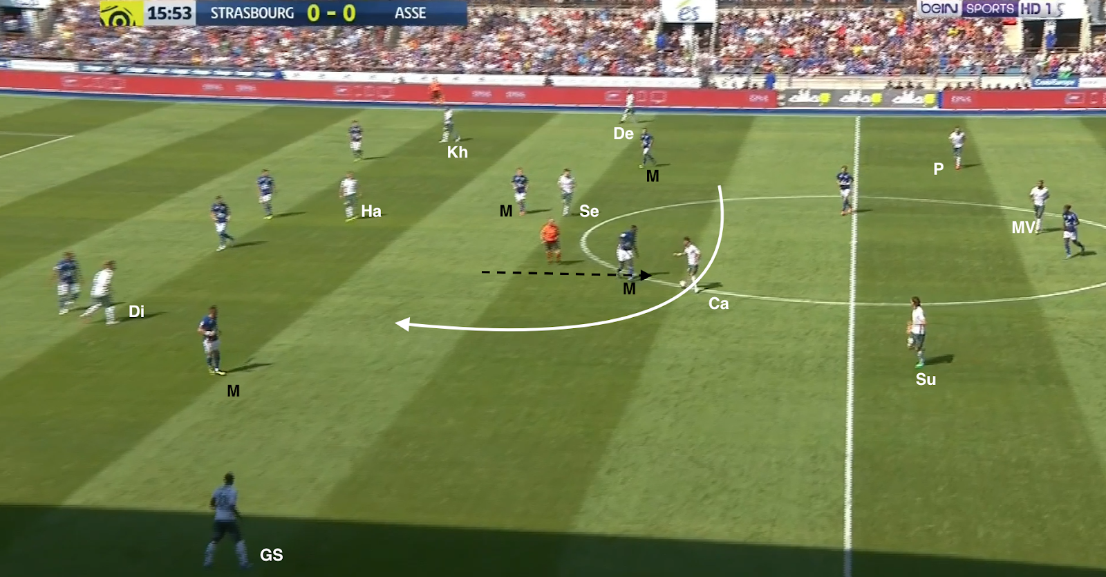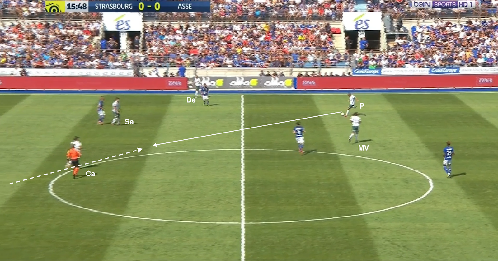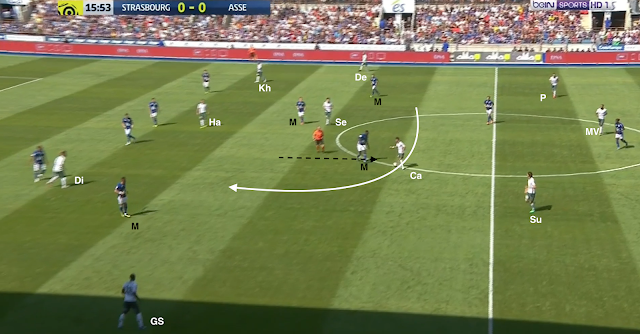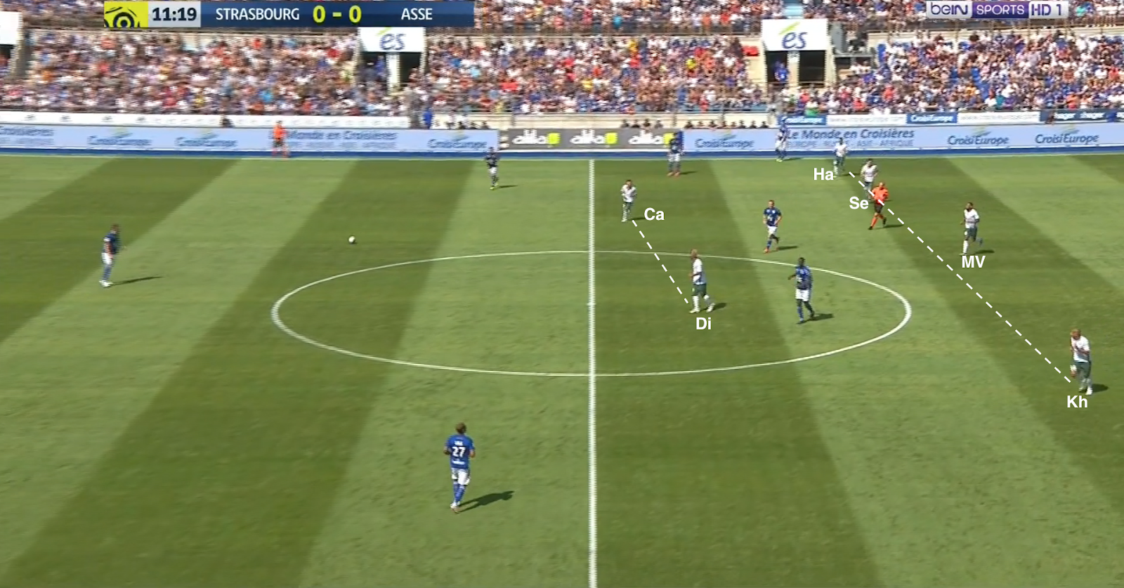 ... avant de le redonner à Cabella, toujours assez bas. Sur cette image on peut voir les trois autres offensifs, Khazri en ailier droit, Hamouma en ailier gauche et Diony en avant-centre, ainsi que Selnaes (pris par un milieu axial) qui se trouve plus haut que Cabella (qui avait réussi à se défaire de son milieu axial). La dernière recrue des Verts à donc le champ libre devant lui et monte avec le ballon :