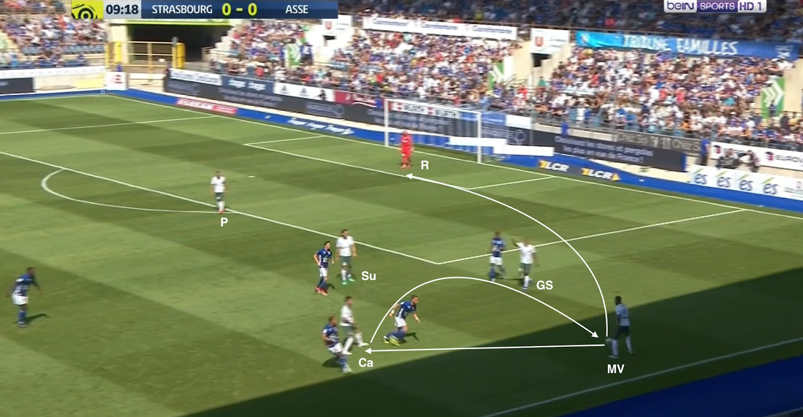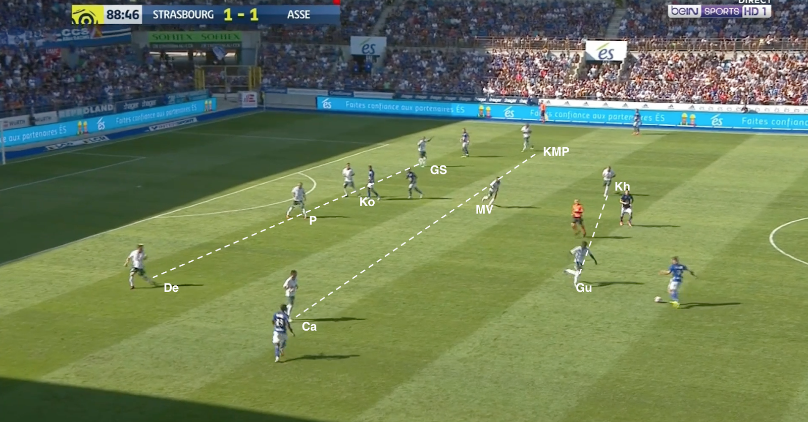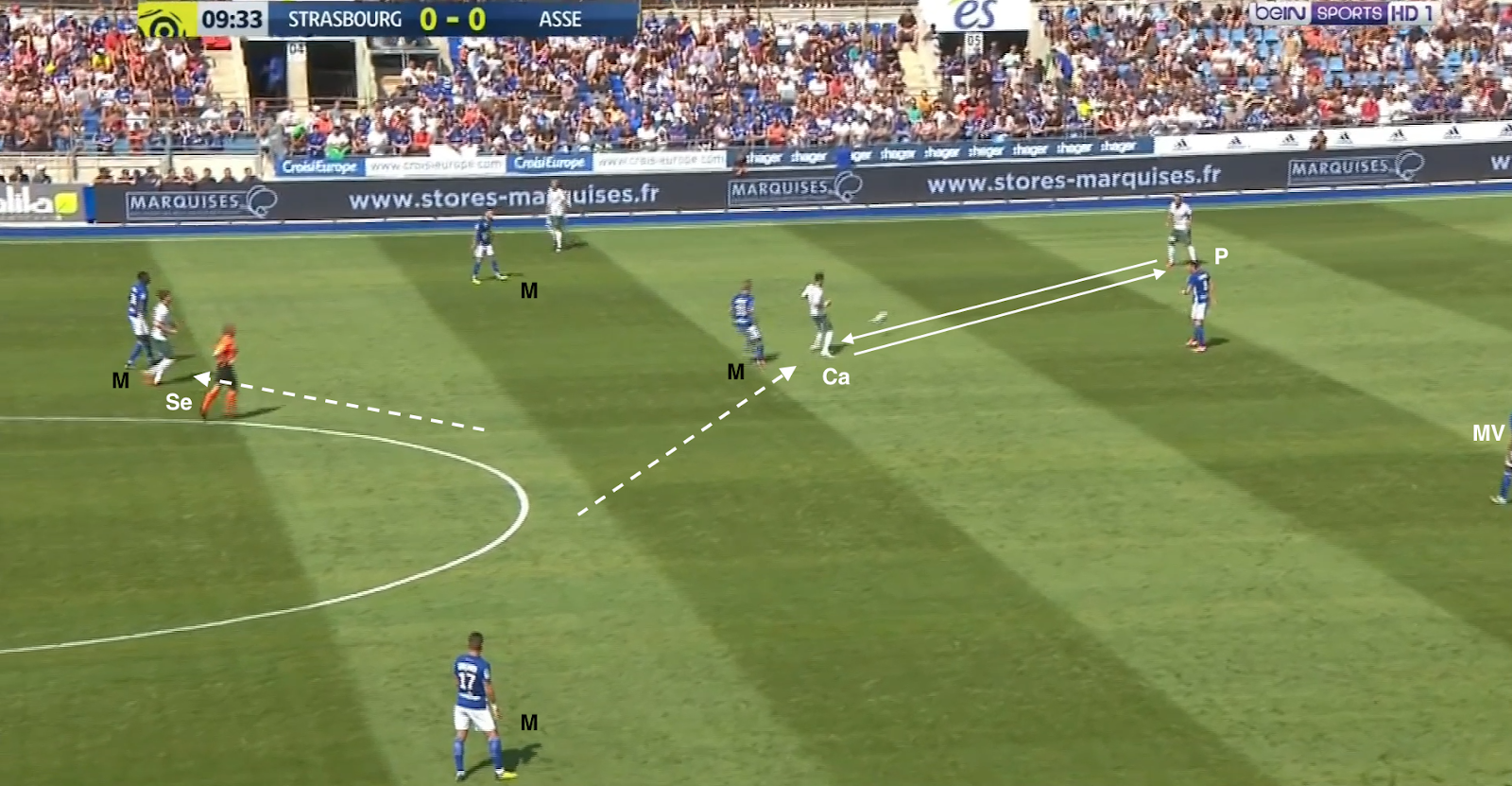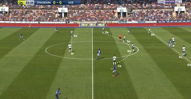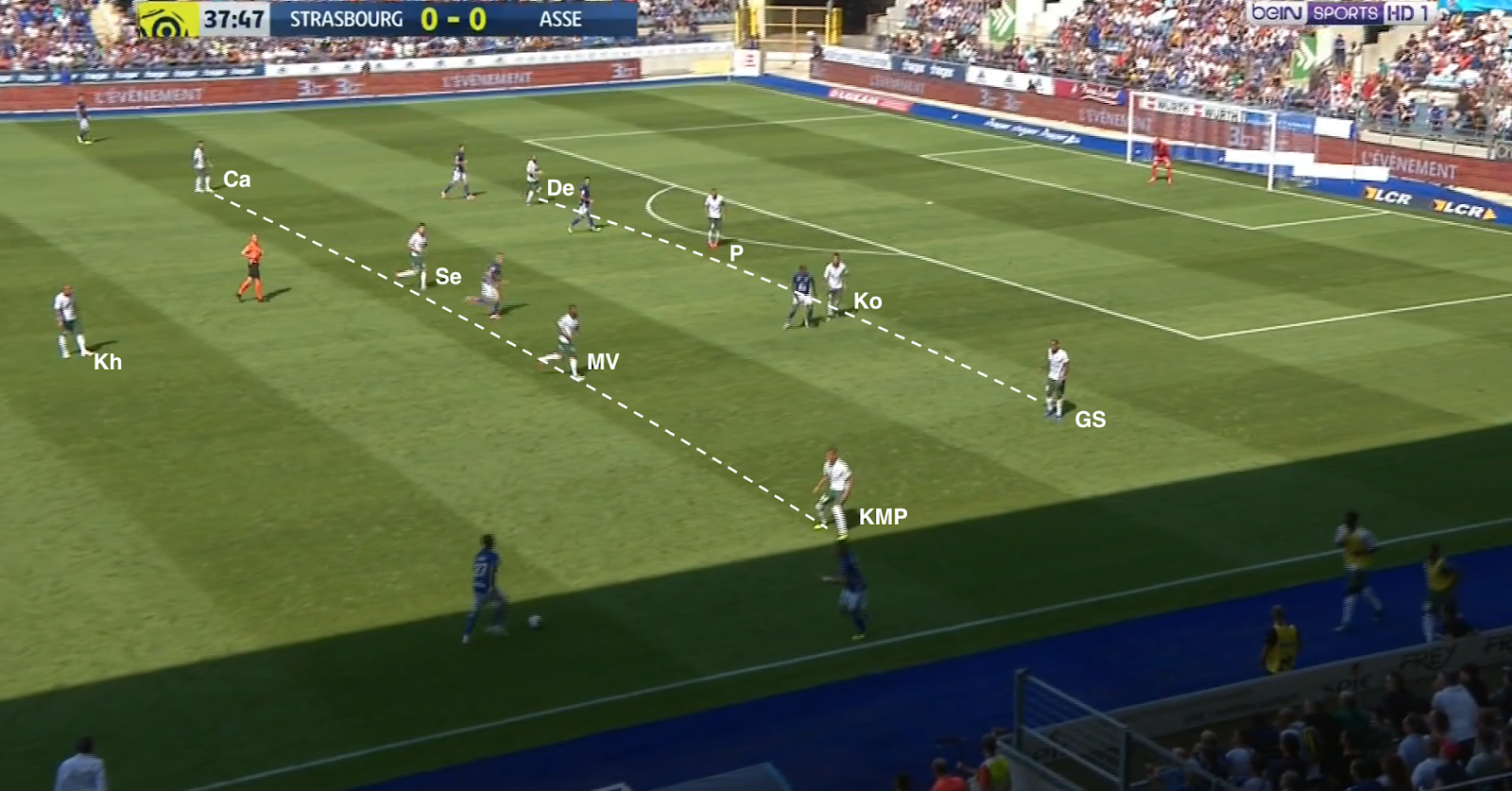 ... avant de le redonner à Cabella, toujours assez bas. Sur cette image on peut voir les trois autres offensifs, Khazri en ailier droit, Hamouma en ailier gauche et Diony en avant-centre, ainsi que Selnaes (pris par un milieu axial) qui se trouve plus haut que Cabella (qui avait réussi à se défaire de son milieu axial). La dernière recrue des Verts à donc le champ libre devant lui et monte avec le ballon :