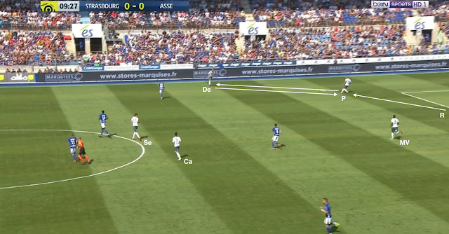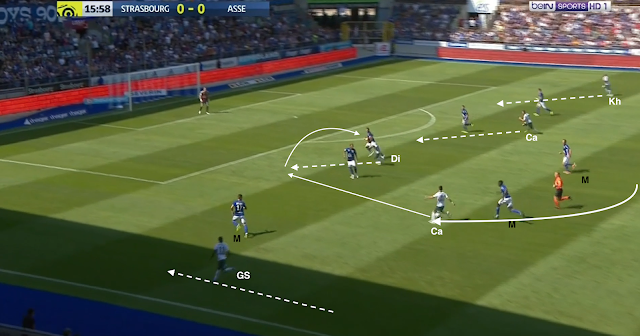 Six minutes plus tard, un long ballon de Strasbourg est dégagé par Subotic dans les pieds de Cabella, qui se retourne de suite pour partir à l'attaque :
