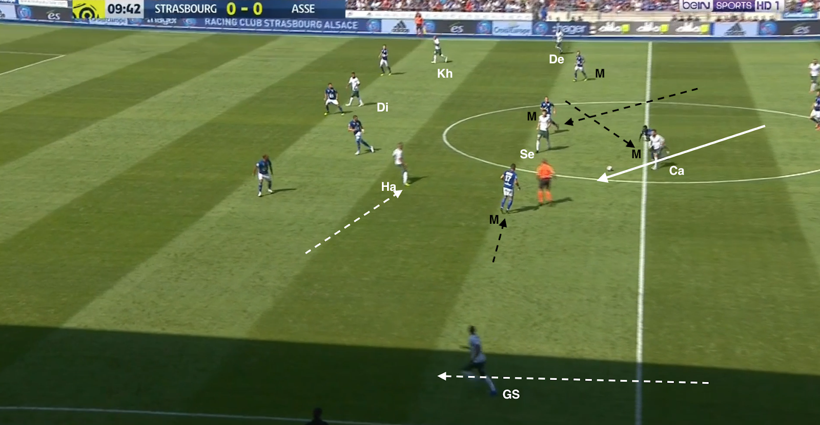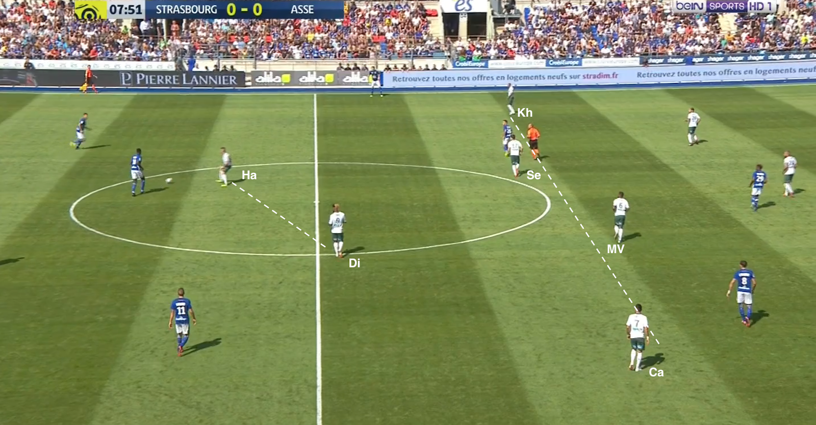 ... avant de le redonner à Cabella, toujours assez bas. Sur cette image on peut voir les trois autres offensifs, Khazri en ailier droit, Hamouma en ailier gauche et Diony en avant-centre, ainsi que Selnaes (pris par un milieu axial) qui se trouve plus haut que Cabella (qui avait réussi à se défaire de son milieu axial). La dernière recrue des Verts à donc le champ libre devant lui et monte avec le ballon :
