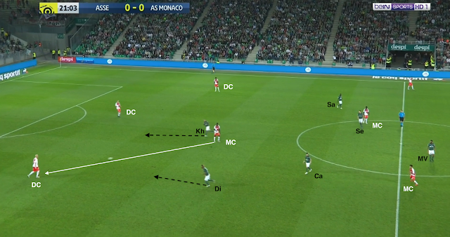 Un choix tactique qui semble judicieux, même si c'est une approche très défensive, Monaco ressemblant ainsi à une petite équipe qui essaye de bétonner et jouer les contres quand elle se déplace à Geoffroy-Guichard. Mais ce système a été facilement déjoué par l'ASSE, comme par exemple à la 30e minute :