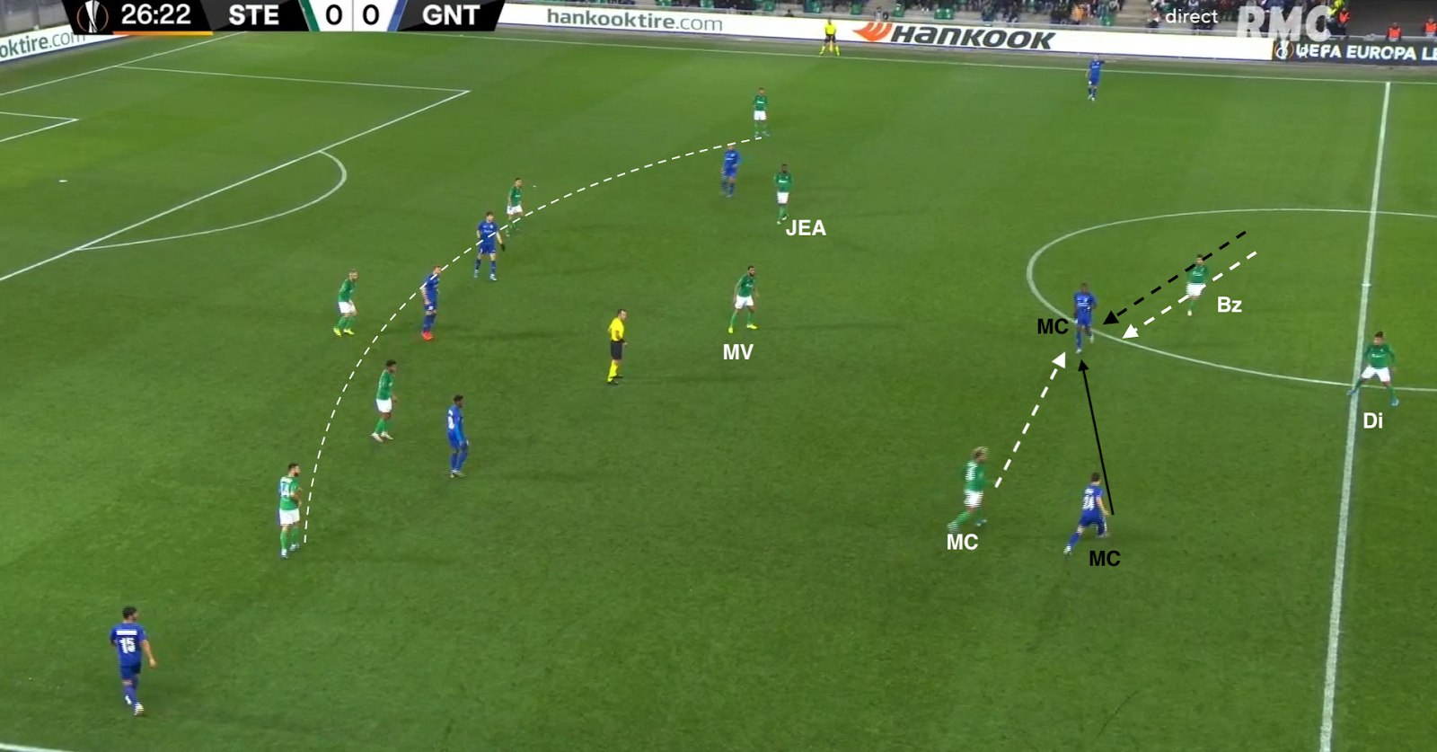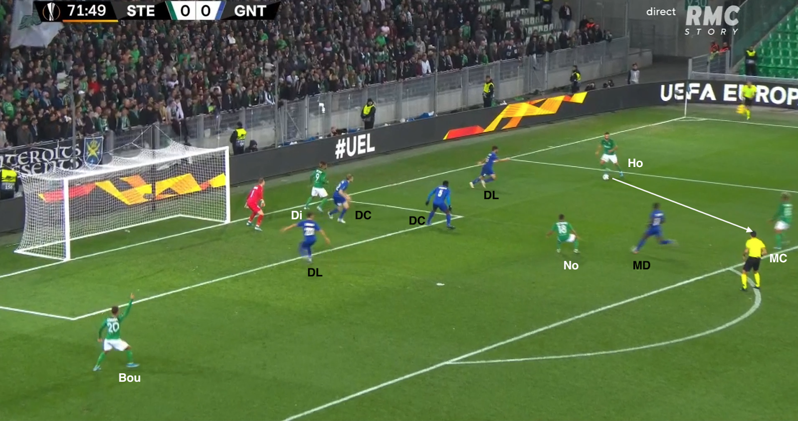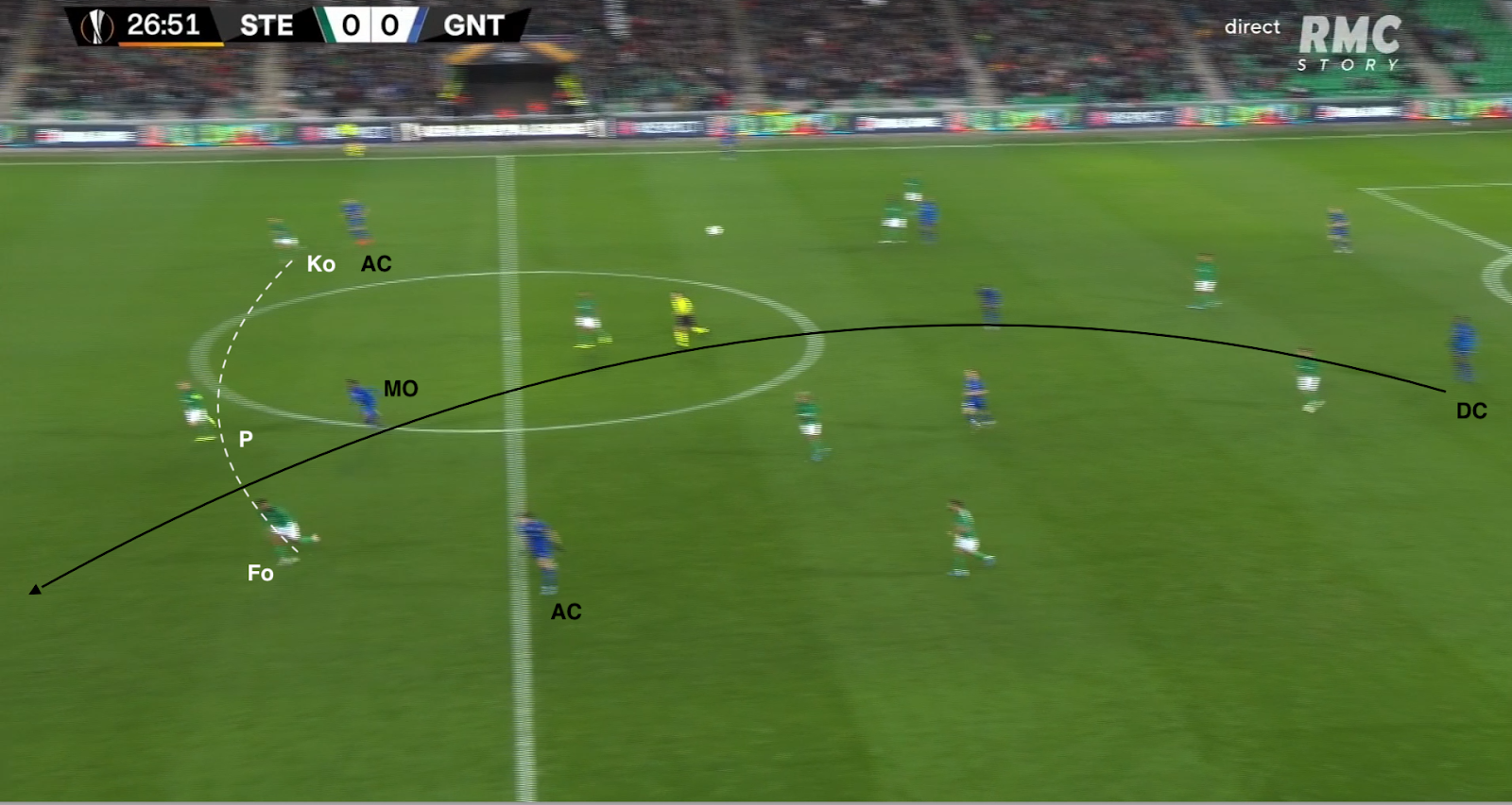 Il reçoit le ballon de Bouanga, qui va plus haut dans le couloir, avant de servir Kolo, qui monte de la défense. La Gantoise joue dans un 4-4-2 losange, donc avec un seul jouer de côté, le défenseur latéral. Si les Verts y mettent un deuxième, c'est un avant-centre qui vient couvrir, surtout que les milieux sont au marquage des axiaux stéphanois (et de Nordin, positionné comme un "10") :