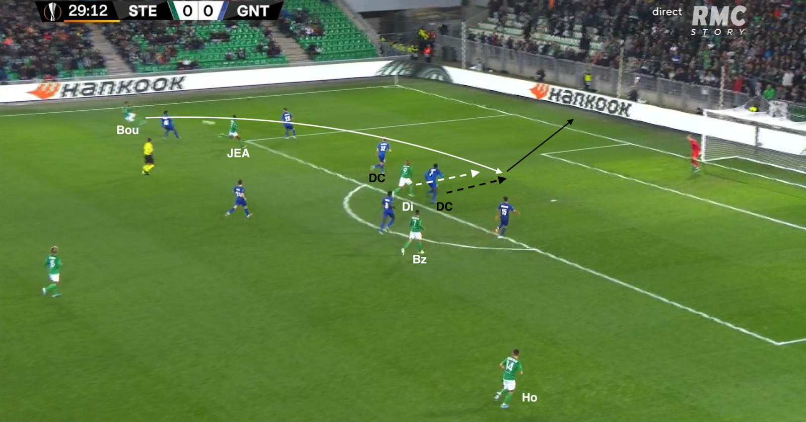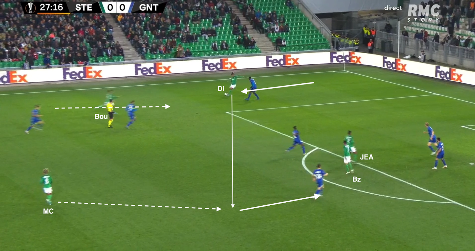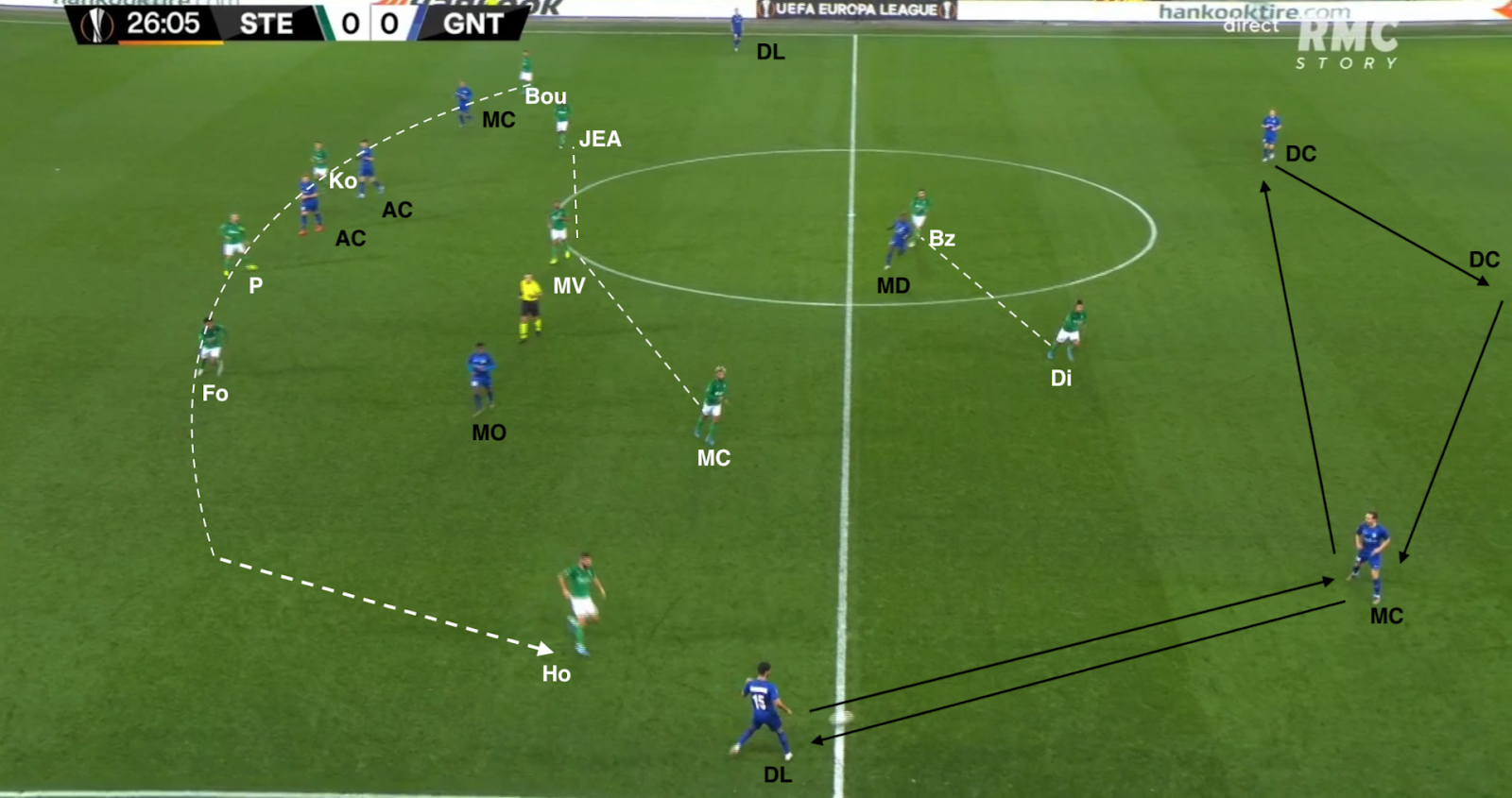 Il reçoit le ballon de Bouanga, qui va plus haut dans le couloir, avant de servir Kolo, qui monte de la défense. La Gantoise joue dans un 4-4-2 losange, donc avec un seul jouer de côté, le défenseur latéral. Si les Verts y mettent un deuxième, c'est un avant-centre qui vient couvrir, surtout que les milieux sont au marquage des axiaux stéphanois (et de Nordin, positionné comme un "10") :