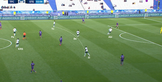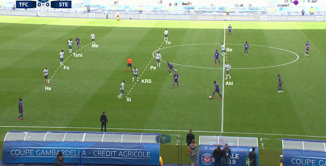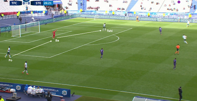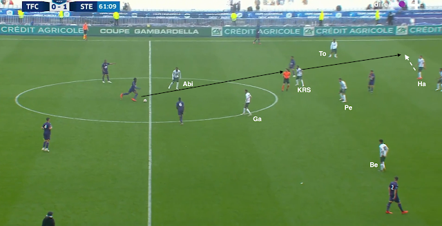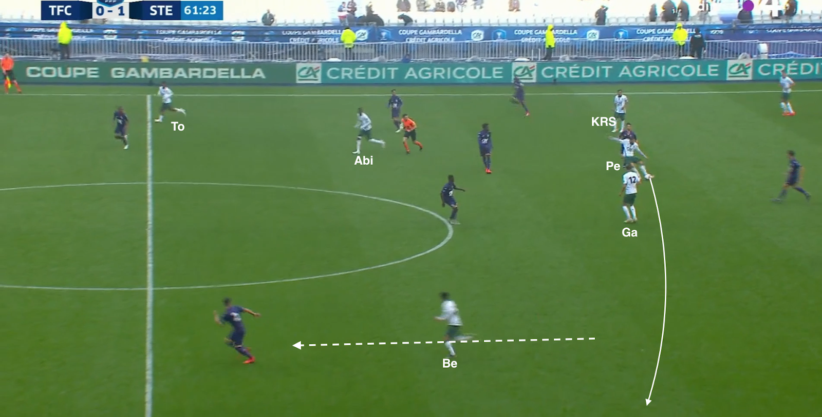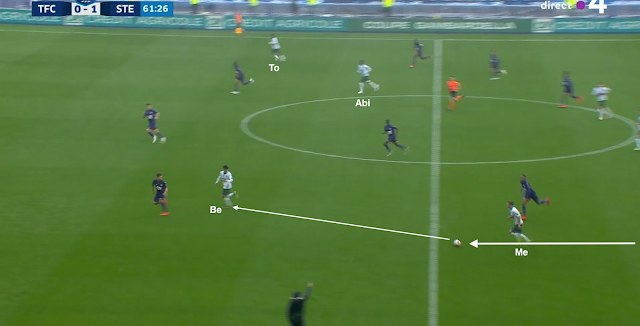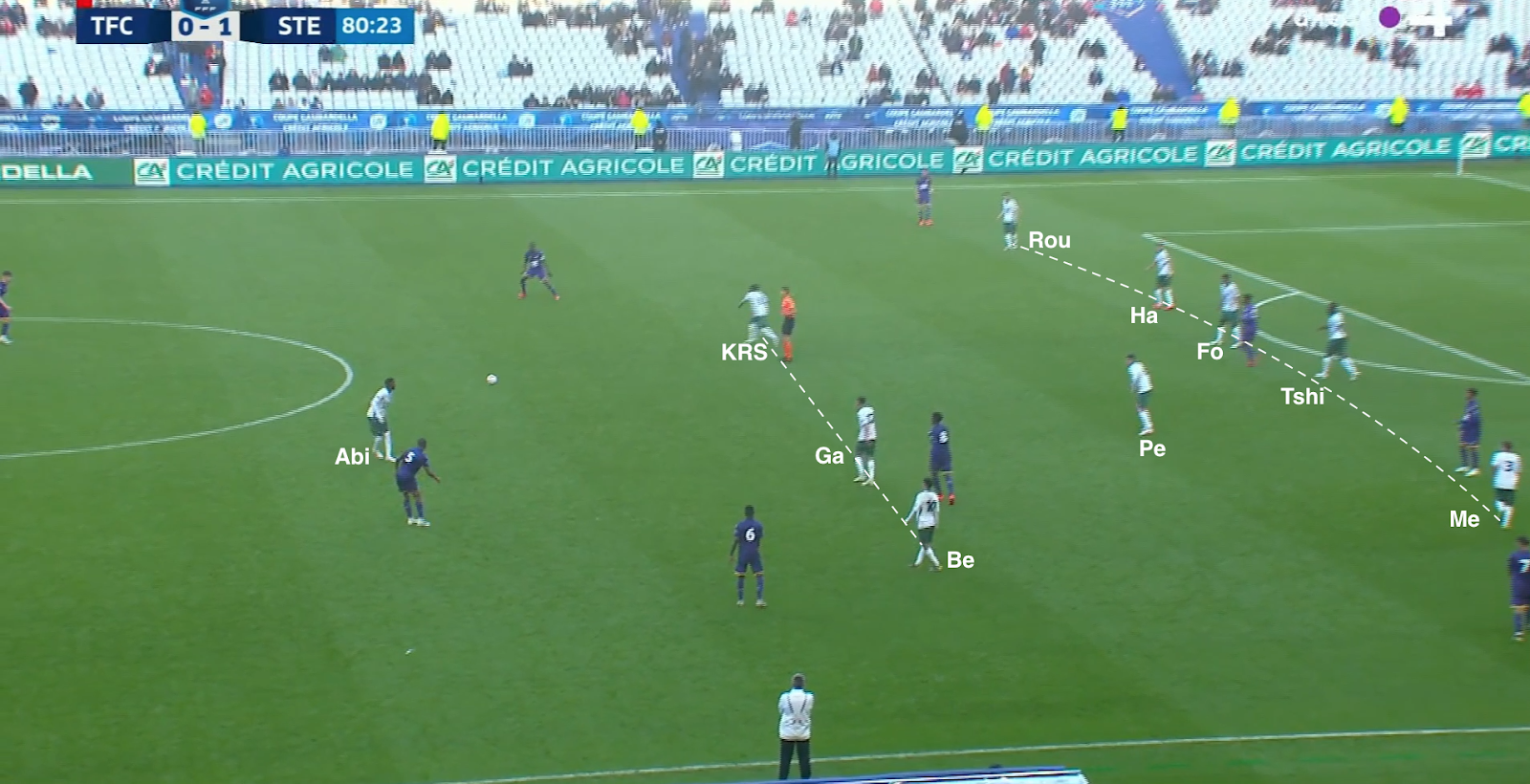 Après l'ouverture du score, les Verts ont clairement fait un pas en arrière et on laissé la possession au TFC, préférant les contres, comme dans cet exemple à la 62e :