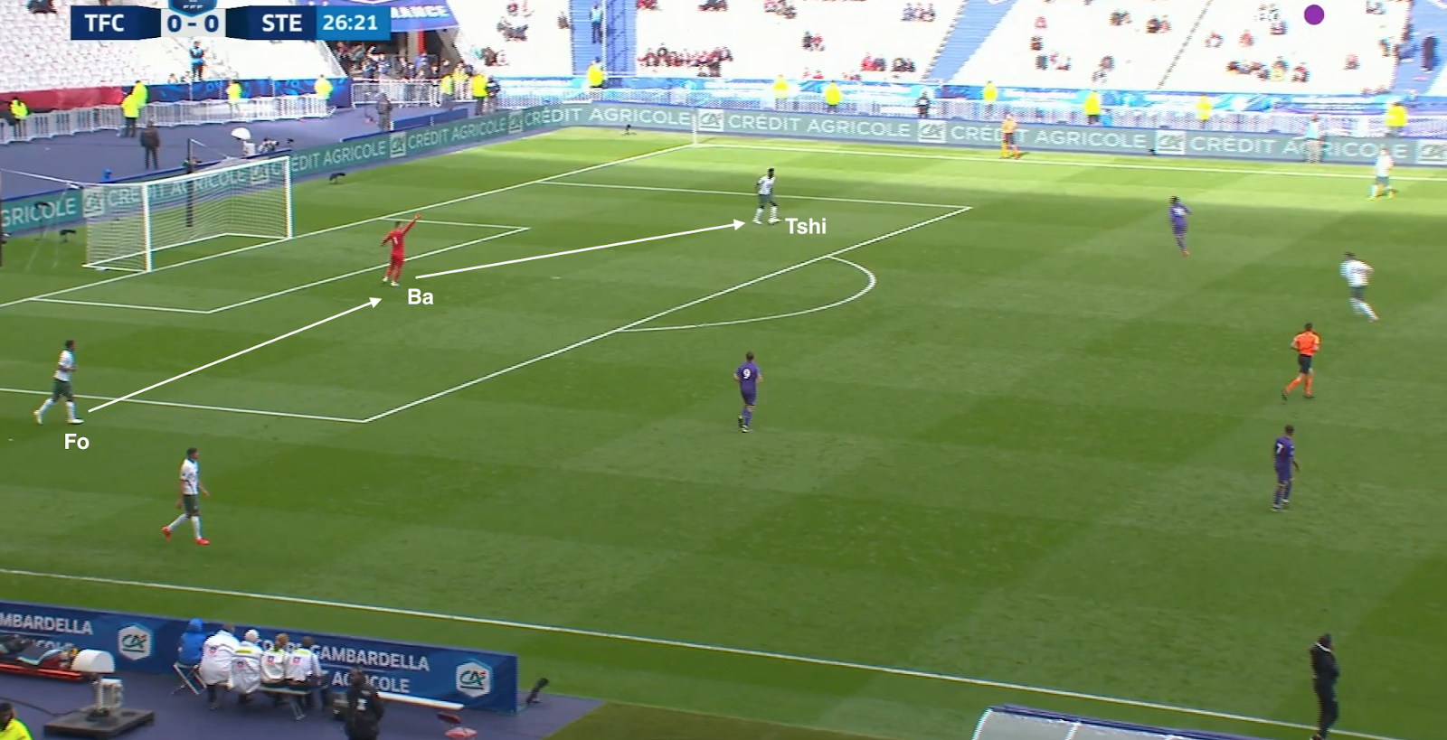 Il écarte avec Wesley Fofana, avant de lui proposer une solution de passe. Le premier rideau adverse est dépassé et le capitaine stéphanois a le jeu devant lui :