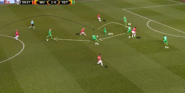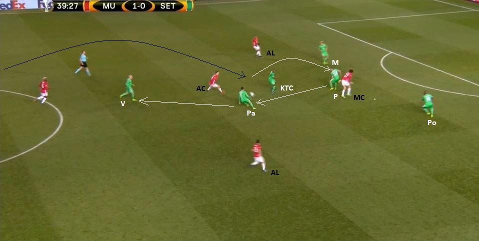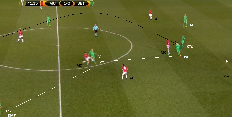 Dans cette longue action, sur trois minutes de jeu, on a tiré 4 fois, dont 3 de la surface, sans que le portier adverse fasse le moindre arrêt. Avec un bloc bien en place, avec des duels aériens gagnés et en exploitant au maximum un point faible clairement identifié, le couloir droit de Manchester. Un but marqué lors de ce temps fort, juste avant la pause, aurait bien changé la donne et probablement la deuxième période aurait été différente, ainsi que le match retour.