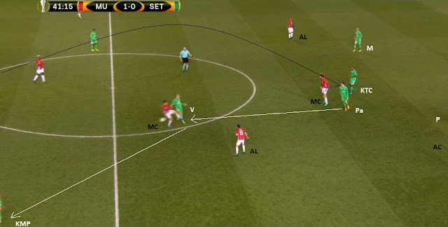 ... mais récupéré sans problème par notre défense. Et dans trois petites passes rapides on lance de nouveau un joueur dans un couloir gauche libre, l'ailier étant rentré dans l'axe et le latéral occupé avec KMP :