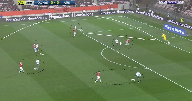 12 secondes plus tard, après avoir échoué à éliminer KMP et Selnaes, il lâche enfin le ballon, en écartant vers la droite. Comme aucun des trois offensifs stéphanois ne fait l'effort de défendre, on trouve 4 Niçois sur la même ligne contre seulement 3 Stéphanois (Selnaes - KMP - M'Vila). Et comme Polomat est occupé avec son adversaire direct dans le couloir, Kolo doit sortir de la défense. A partir de ce moment, c'est un duel à 3-contre-3 dans cette zone du terrain :