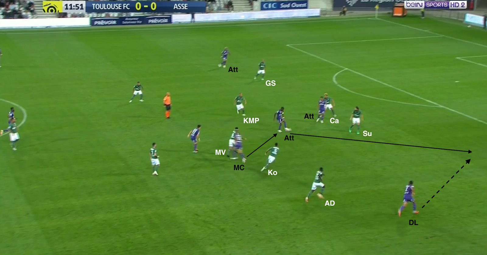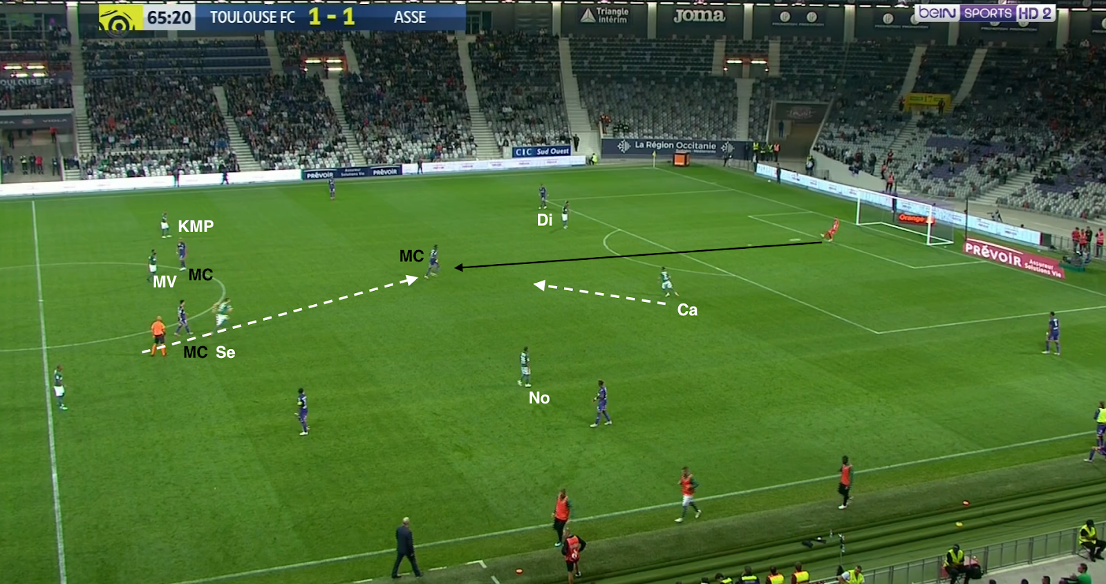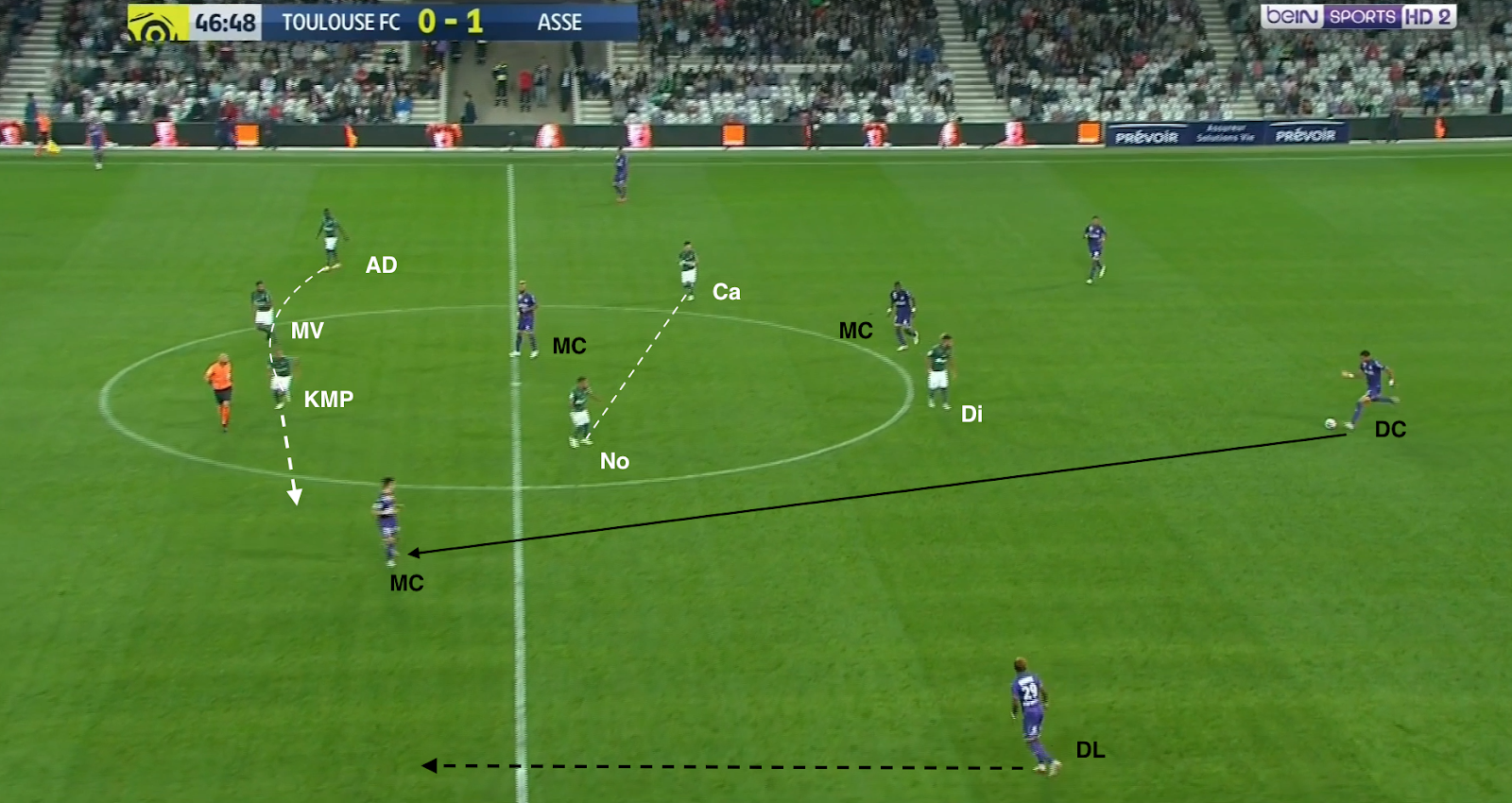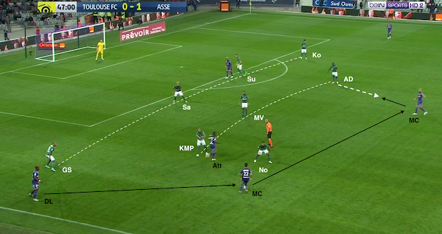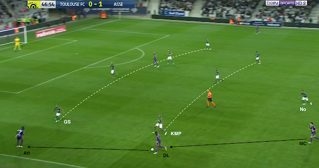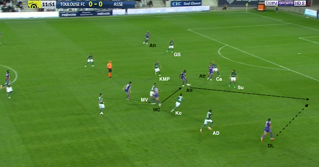 ... le décalage est créé. Il n'y a personne pour prendre l'attaquant placé entre les lignes, qui lance le latéral dans l'espace libéré. Heureusement sur son centre au 2e poteau, Gabriel Silva est poussé dans le dos par un adversaire et les Verts récupèrent la faute. Ça ne devrait pas être facile de trouver un joueur entre les lignes, surtout dans un bloc bas et compact, mais les Toulousains y sont parvenus deux fois dans cet exemple. Avec trois milieux, si un doit couvrir le couloir, il y a tout simplement plus d'espace pour les passes, soit dans l'axe, soit vers le côté.