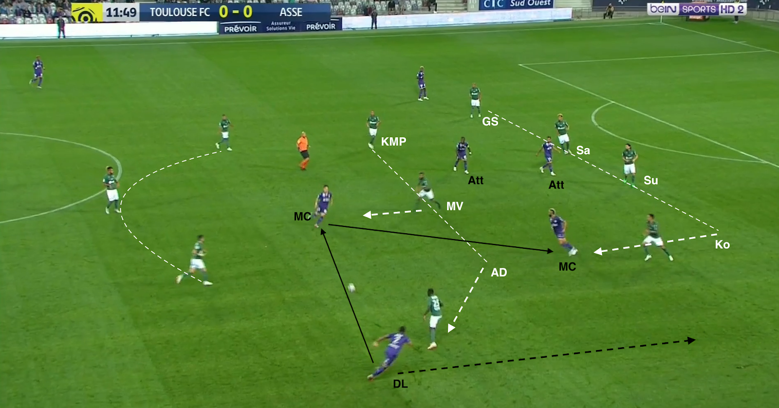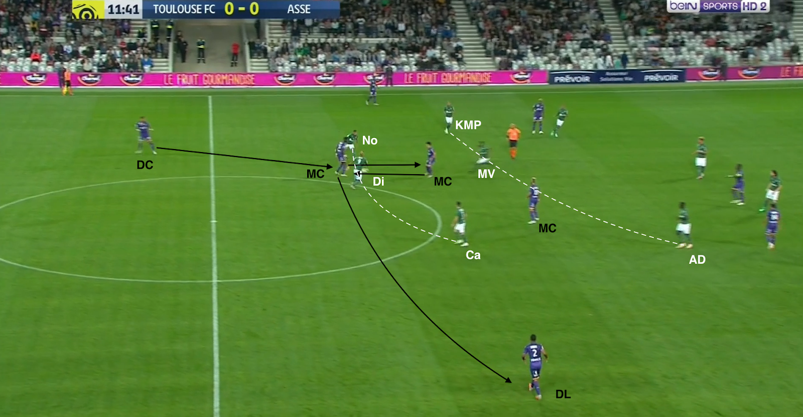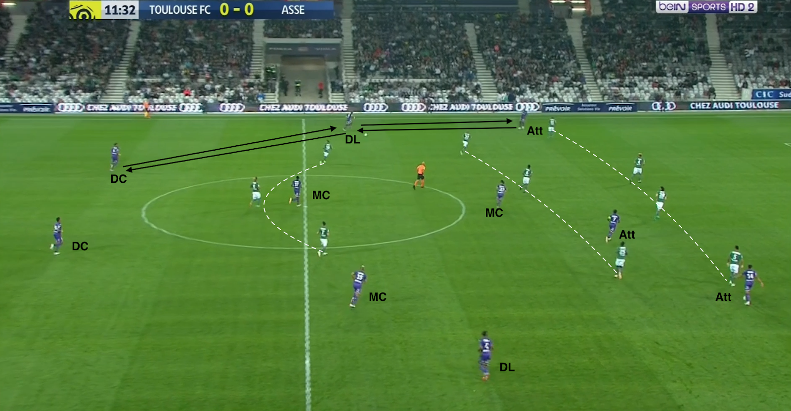 ... le décalage est créé. Il n'y a personne pour prendre l'attaquant placé entre les lignes, qui lance le latéral dans l'espace libéré. Heureusement sur son centre au 2e poteau, Gabriel Silva est poussé dans le dos par un adversaire et les Verts récupèrent la faute. Ça ne devrait pas être facile de trouver un joueur entre les lignes, surtout dans un bloc bas et compact, mais les Toulousains y sont parvenus deux fois dans cet exemple. Avec trois milieux, si un doit couvrir le couloir, il y a tout simplement plus d'espace pour les passes, soit dans l'axe, soit vers le côté.