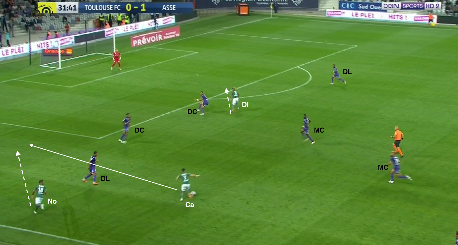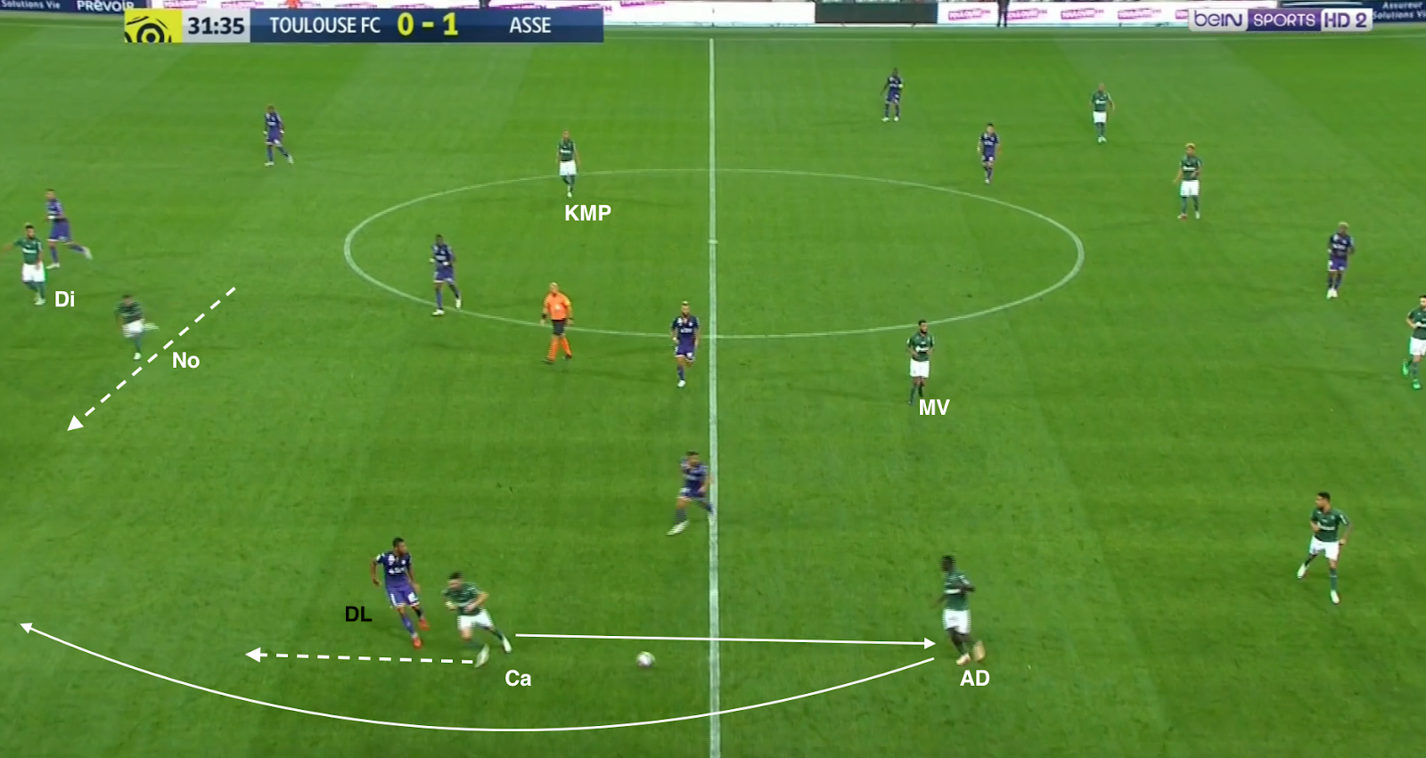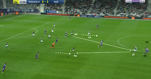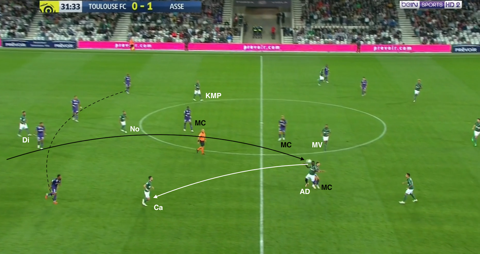 Nordin fait un appel dans l'espace libéré par le latéral droit adverse qui était allé après Cabella. Ce dernier remet en arrière à Diousse avant de faire le même appel. On retrouve ainsi les deux électrons libres stéphanois dans la même zone du terrain :