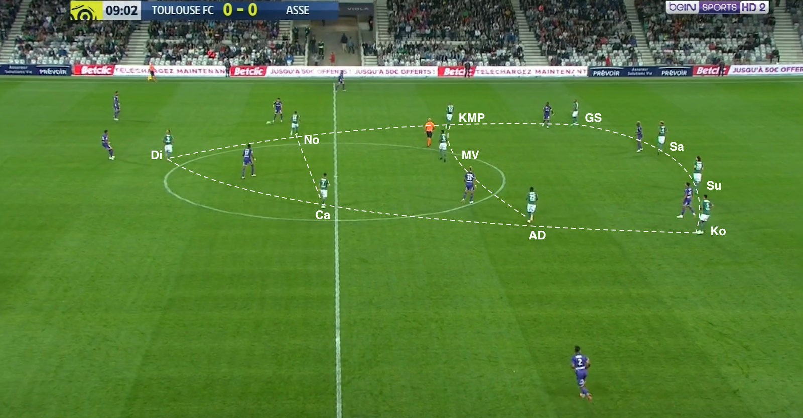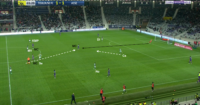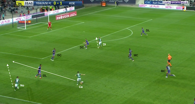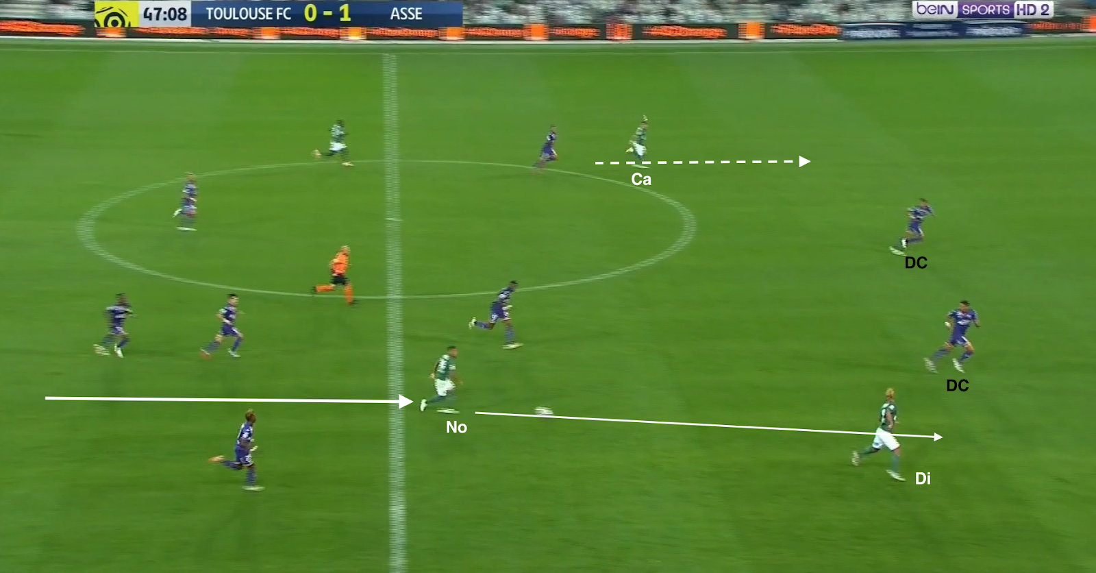 Nordin fait un appel dans l'espace libéré par le latéral droit adverse qui était allé après Cabella. Ce dernier remet en arrière à Diousse avant de faire le même appel. On retrouve ainsi les deux électrons libres stéphanois dans la même zone du terrain :