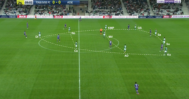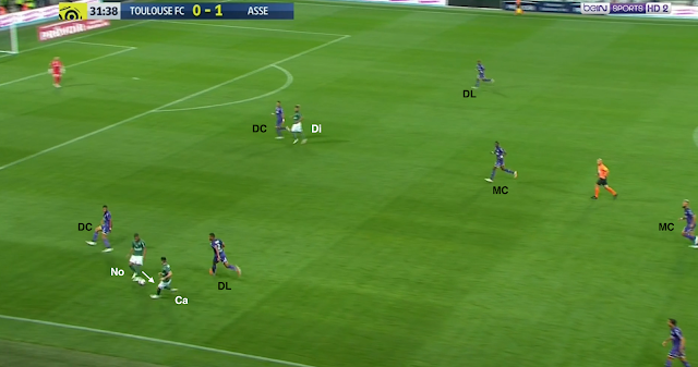 Le choix de ce système devient encore plus surprenant si on prend en compte que l'ASSE n'a pas cherché à avoir et n'a pas eu la possession à Toulouse et que les latéraux ont peu pesé sur le jeu. Ces éléments et quelques avantages et inconvénients de ce sapin de Noël seront visibles dans les exemples suivants.