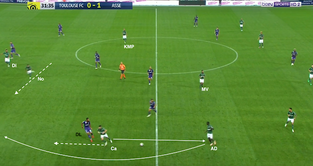 Malgré l'appel de Cabella à gauche, il préfère Diony à droite et finalement le ballon est perdu dans le duel contre le défenseur. Même si aucun des trois buts de l'ASSE n'a été marqué suite à un contre, la présence et le positionnement de ces trois joueurs offensifs laissent penser que c'était le plan de jeu envisagé par le staff stéphanois.