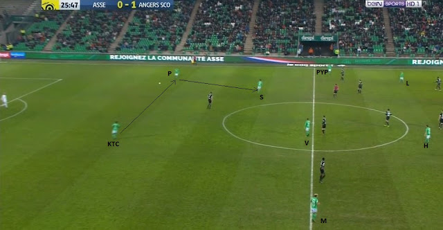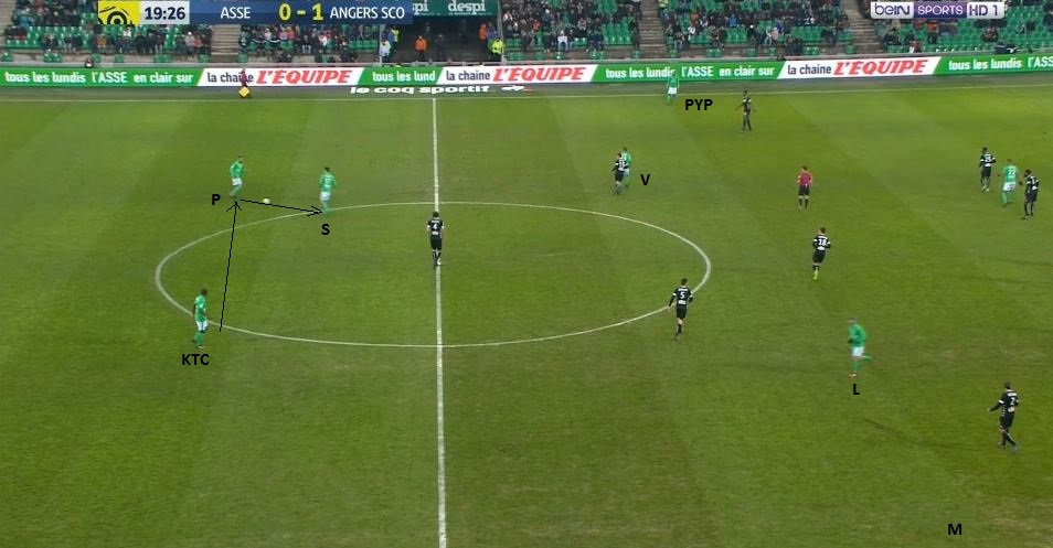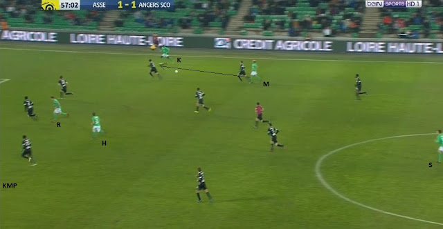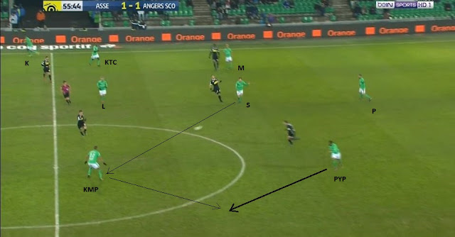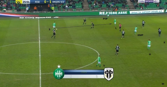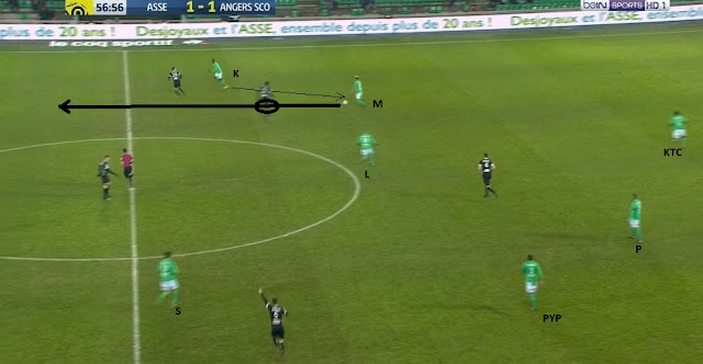 Ce genre de présence offensive est très risqué. On l'a vu pendant la première mi-temps à Bruxelles, à domicile contre Nancy en Coupe de la Ligue, avoir seulement trois joueurs derrière rend l'équipe vulnérable aux contres. Surtout quand c'est une équipe qui est venue défendre bas et jouer les contres à fond, comme Angers qui s'est procuré plusieurs occasions (et un but) en jouant comme ça. Si on regarde une action qui se passe 6 minutes avant le premier exemple, on voit la même construction type, le ballon qui circule sur le trajet KTC - Perrin - Selnaes, cette fois-ci avec Veretout à gauche et Lemoine à droite dans l'axe :