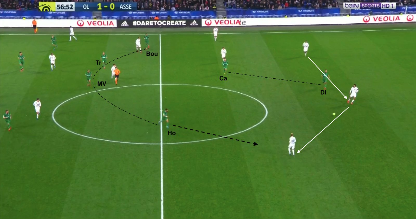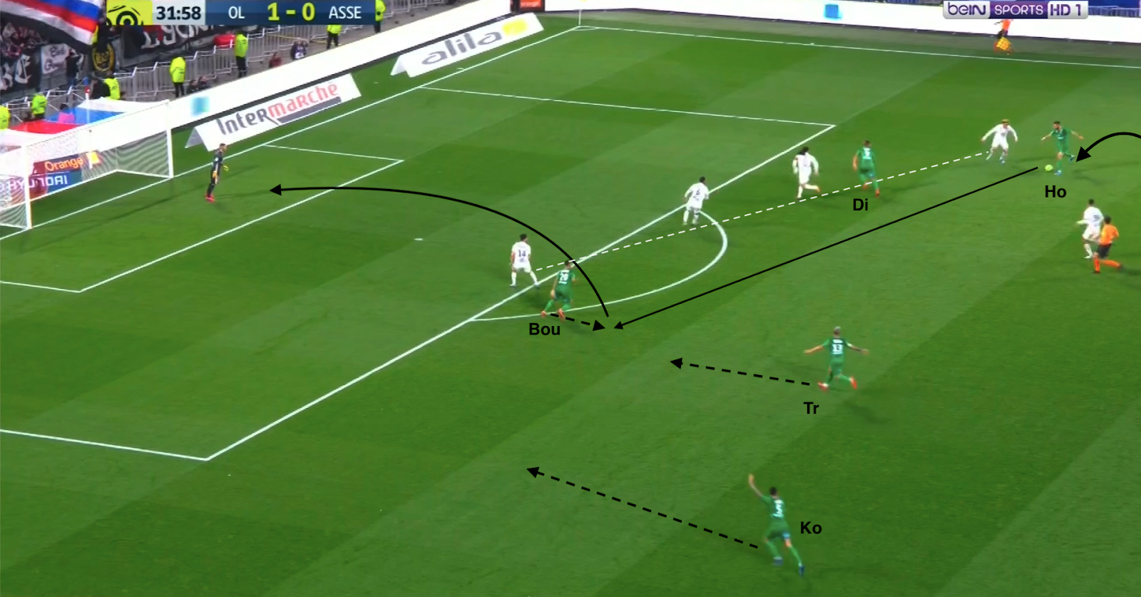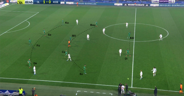 L'adversaire qui se trouvait dans son dos est trouvé, et il joue en arrière avec son compère du milieu : non seulement Diony et Bouanga n'ont pas coupé le progrès du défenseur, ils n'ont pas suivi cet adversaire non plus... Et avec trois passes, le bloc stéphanois est transpercé, le ballon arrive à l'ailier droit. Qui perd le contrôle du ballon...