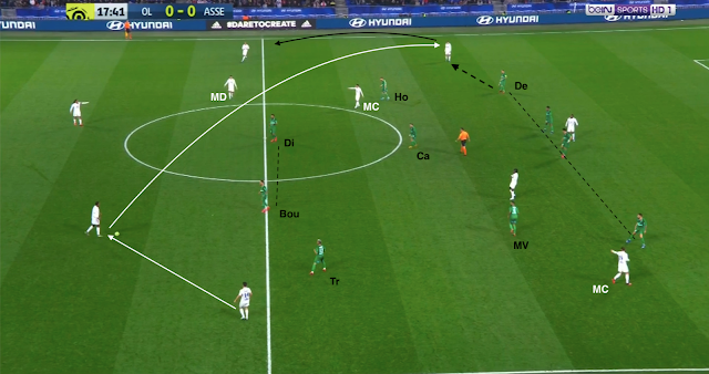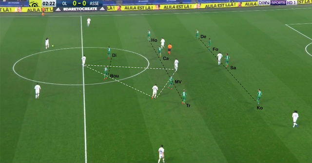 Le bloc stéphanois se remet en place. Le premier rideau empêche la progression du milieu défensif, pendant que les deux autres sont surveillés : un se trouve entre les lignes, pendant que l'autre est pris par Trauco. Sur l'image précédente c'était Honorat qui faisait la même chose du côté opposé - la ligne des Verts coulissait très bien, il n'y avait jamais beaucoup de place entre les milieux axiaux pour que le ballon puisse passer. Mais tout change quand un défenseur central amène du surnombre en montant avec le ballon :