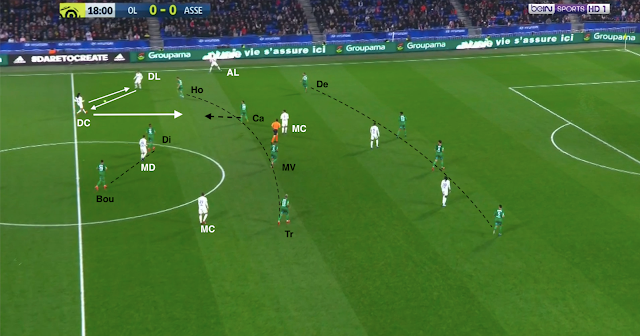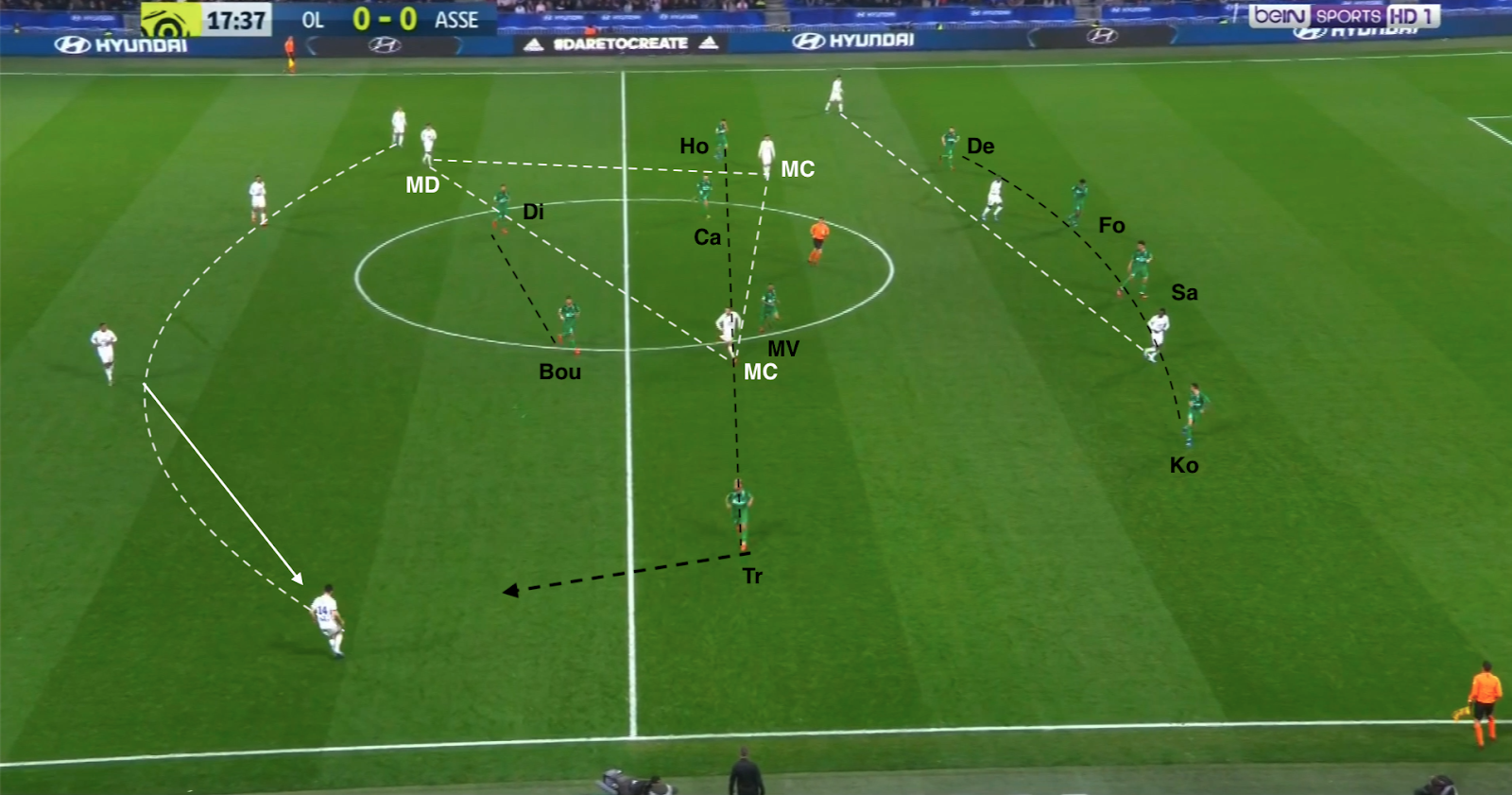 Honorat avance balle au pied, la défense suit les appels de Diony et Bouanga, pendant qu'à l'opposé Trauco et Kolo font des grands signes, étant complètement libres. Ils sont recherchés par la passe d'Honorat, mais Bouanga "intercepte" et tire en première intention, annulant ainsi le décalage créé dans son dos. Une frappe trop molle pour inquiéter le gardien...