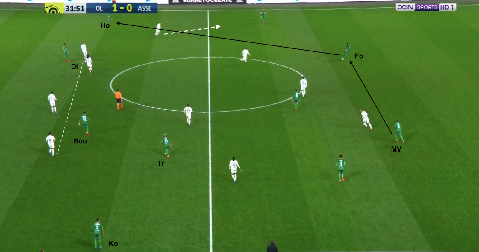 Ce genre d'attaque a été très rare en 1MT, les Verts étant complètement privés du ballon. Ils ont fini la période avec seulement 22% de possession - le plus faible pourcentage d'une équipe sur une période cette saison. Leur bloc a été baladé sans arrêt d'un côté à l'autre et quand ils arrivaient parfois à récupérer le ballon, ils n'arrivaient pas à l'exploiter - à la demi-heure de jeu, plus d'une passe sur deux étaient ratée par les Stéphanois...