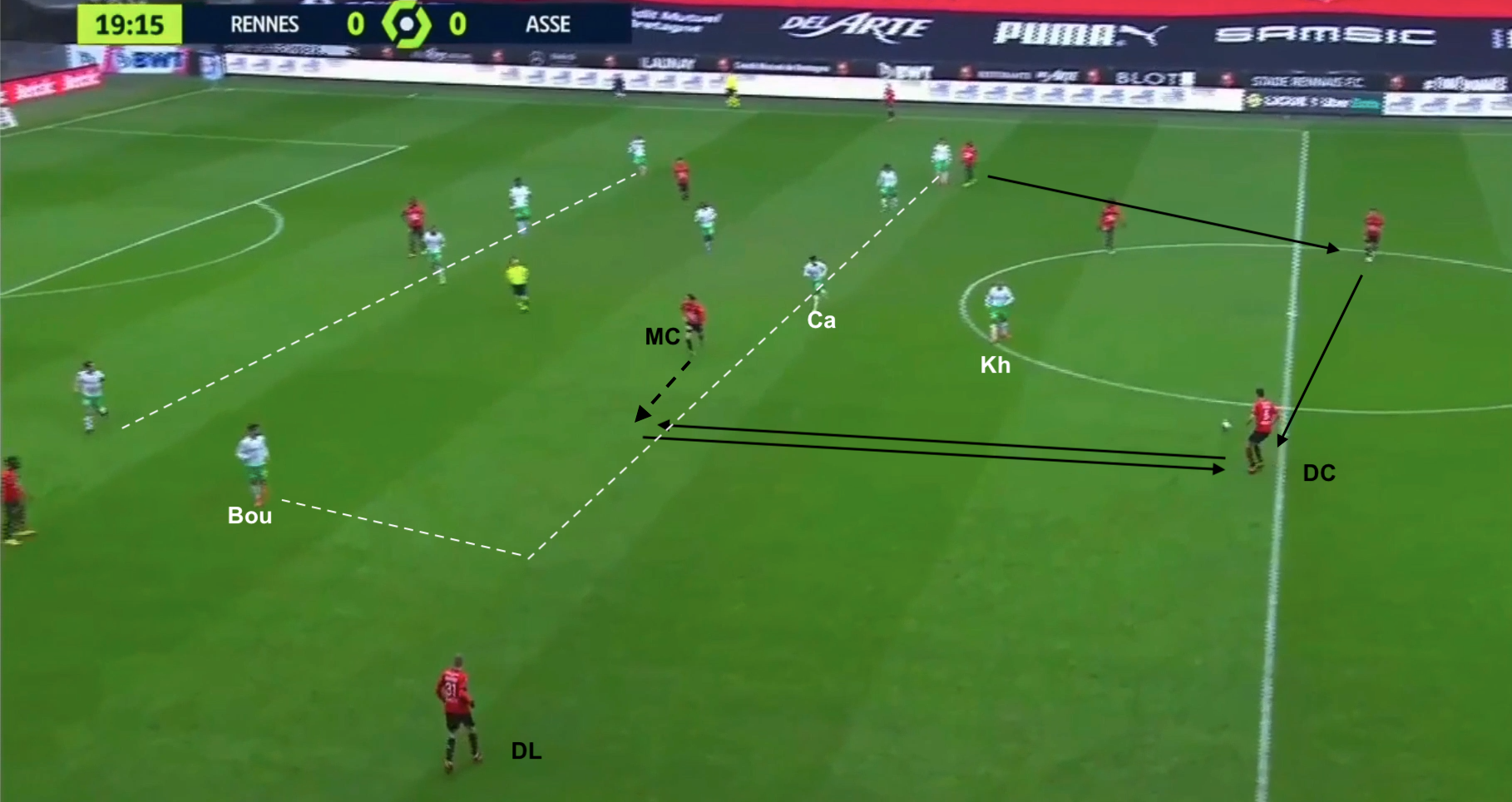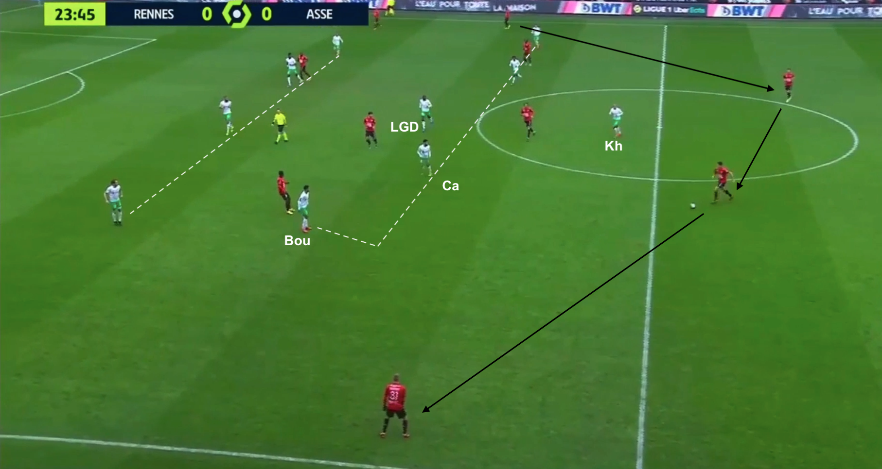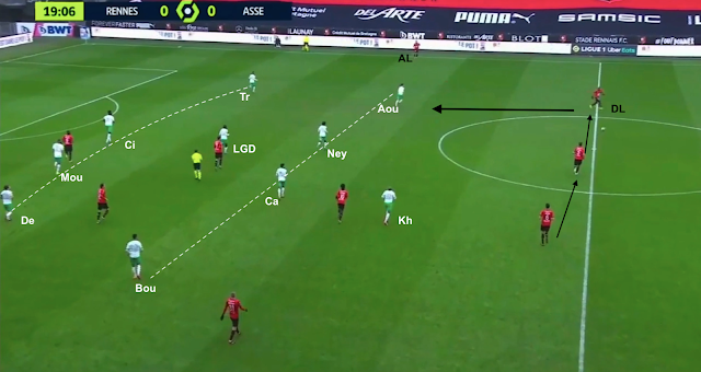 Quelques minutes plus tard, une autre attaque construite pour Rennes, où on peut voir leur système en 4-2-3-1 avec un bloc stéphanois un peu plus haut et Gourna-Douath au marquage du "10" entre les lignes :