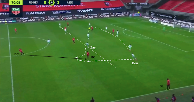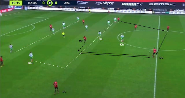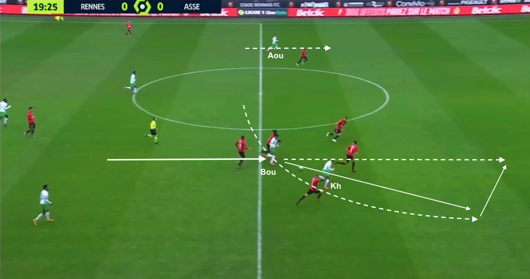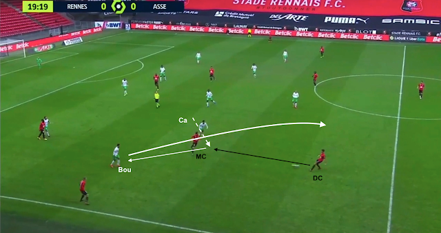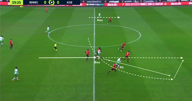 Bouanga est plus bas que les milieux, pendant que Camara sort de la ligne pour presser un milieu adverse. Les Rennais combinent à gauche avant de passer par la défense pour envoyer le jeu à droite :