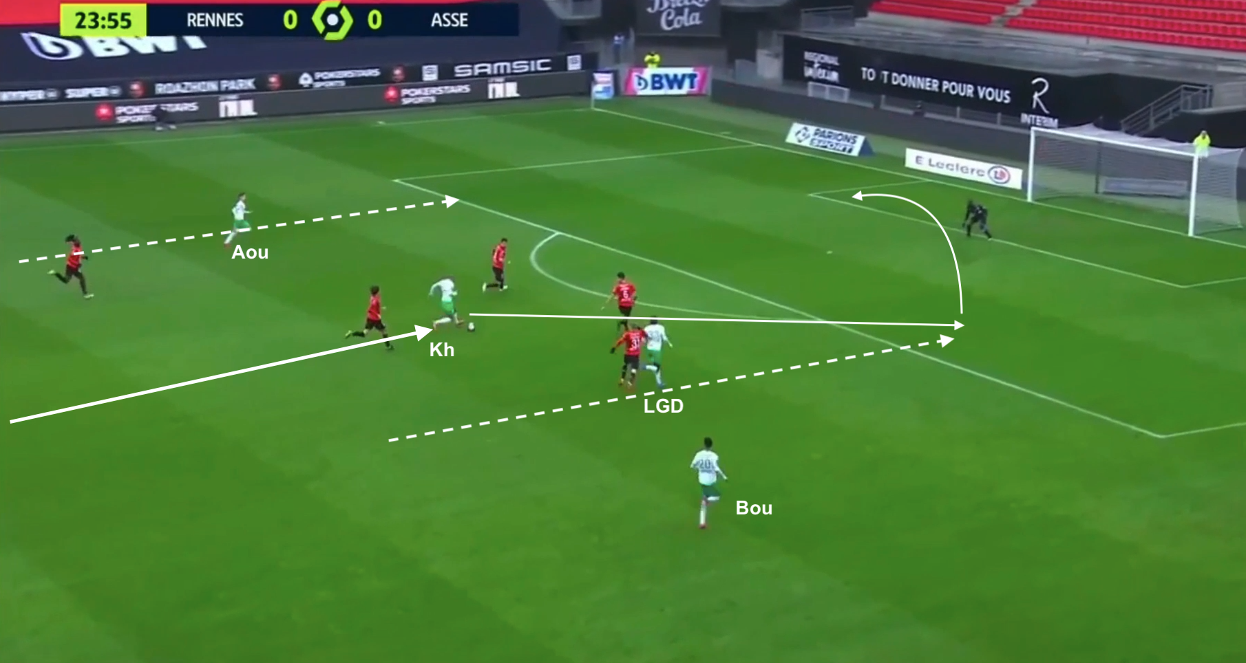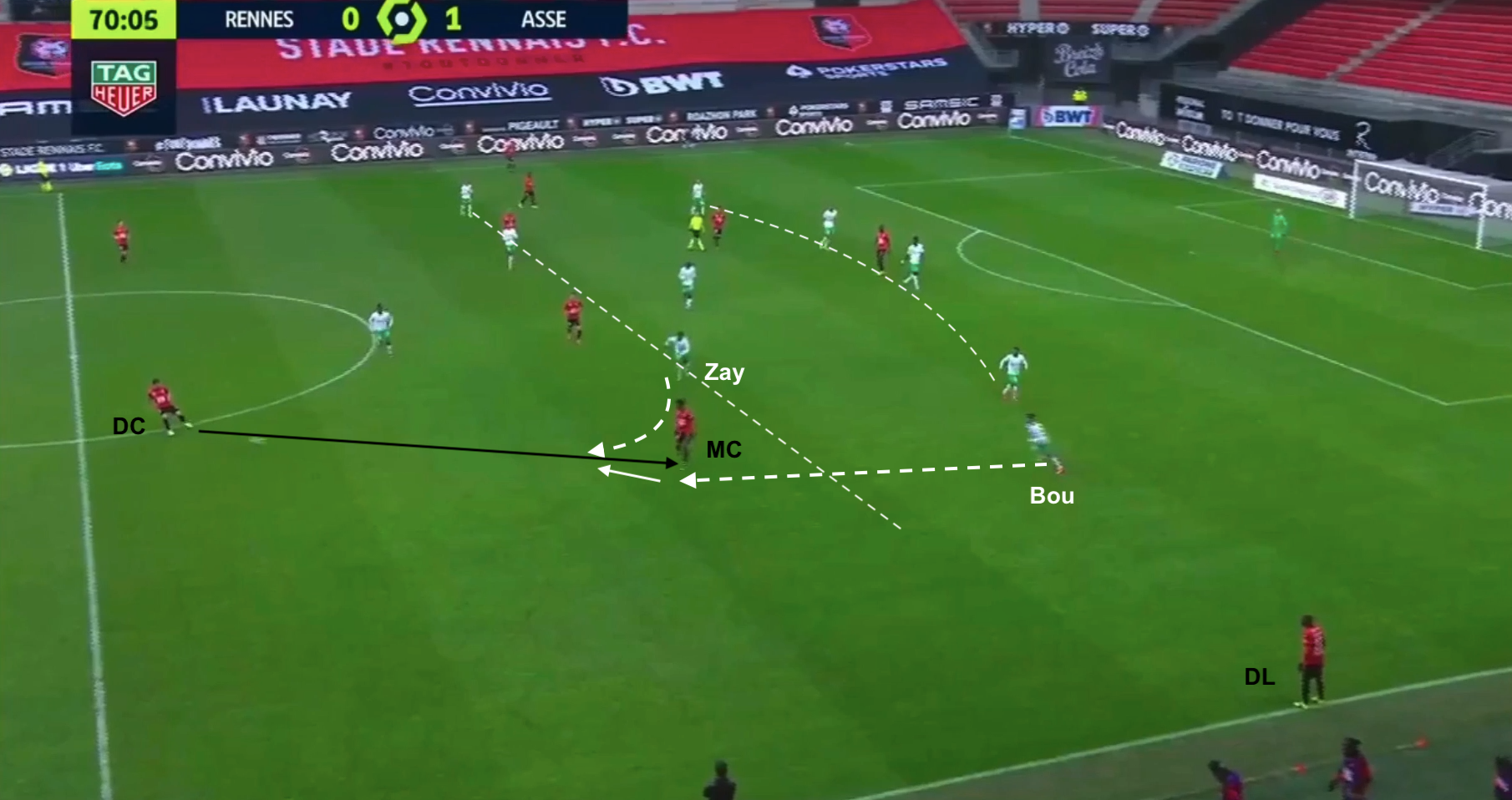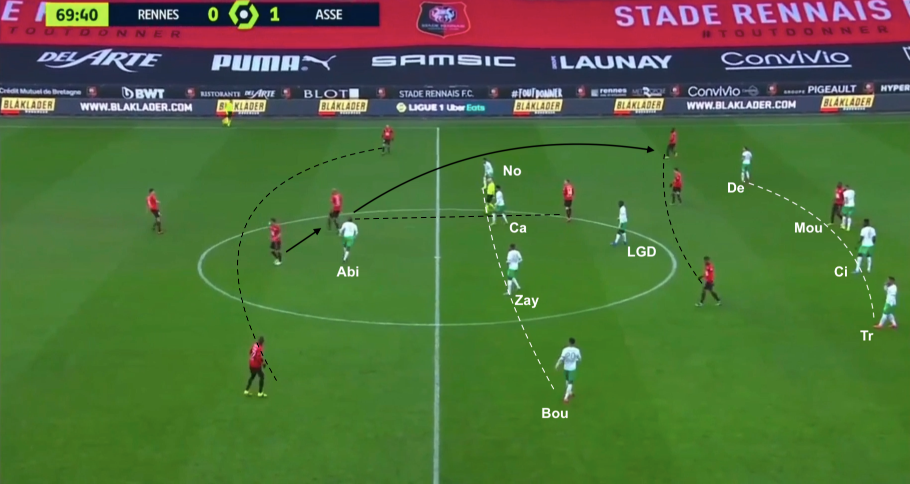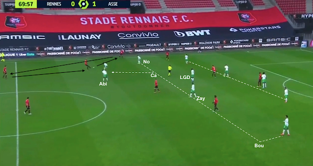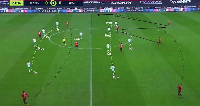 Nordin à la place d'Aouchiche (dans le couloir droit, Bouanga à gauche), Abi à celle de Khazri en avant-centre et Zaydou à celle de Neyou, le 4-1-4-1 est toujours en place, pendant que Rennes attaque toujours en 4-2-3-1. Avant cette capture d'écran la défense stéphanoise avait repoussé deux fois le ballon, récupéré immédiatement par les Rennais, qui relancent sans arrêt. Le ballon est donné à l'ailier gauche...