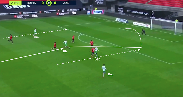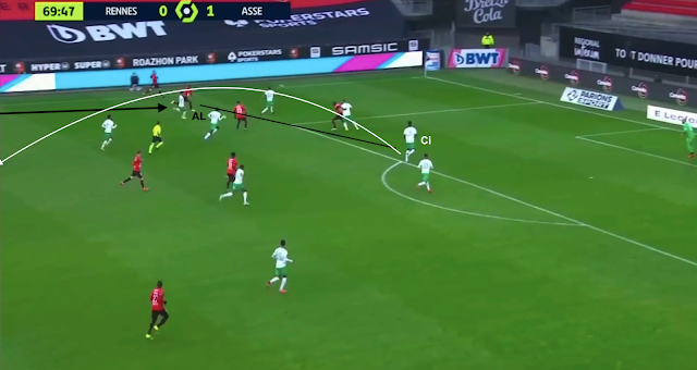 Aouchiche est un peu trop avancé et il a du retard quand le latéral droit adverse est trouvé. Il attrape ce retard et le jeu rennais repasse par la défense pour changer de côté :