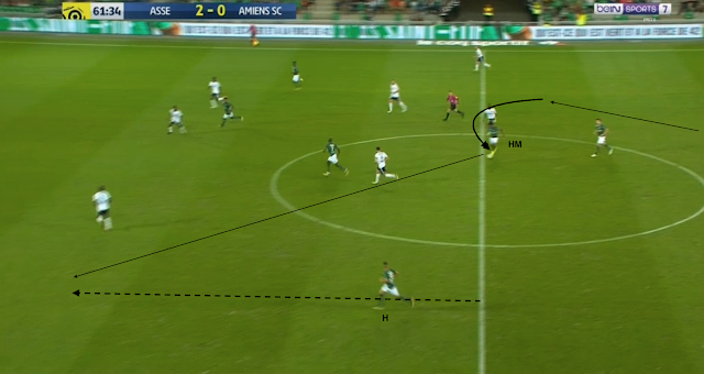 ... mais la passe est interceptée. Il faut aussi dire qu'avec un 5-4-1 en place, Amiens avait à la fois des joueurs dans les couloirs, tout en laissant du monde dans l'axe pour défendre. Perte de ballon haute pour l'ASSE ? La suite devient une habitude - pressing haut pour le récupérer :