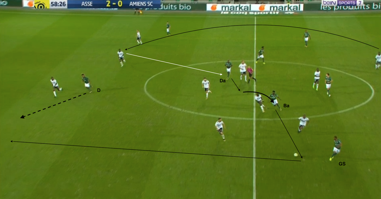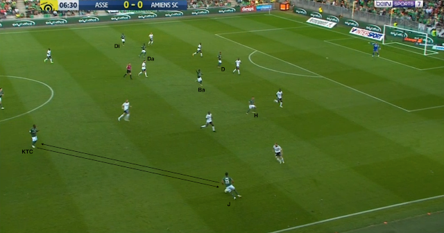 Et finalement, le contre qui n'en est pas un : deux changements sont éffectués par Amiens, coup sur coup, le match est interrompu pendant presque une minute. Dès qu'il reprend, Ruffier lance KTC, qui trouve Bamba avec une belle passe au sol :