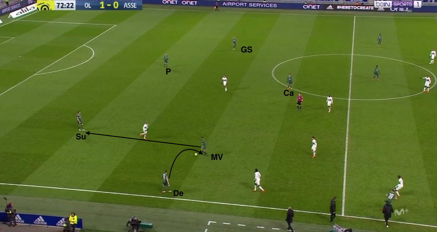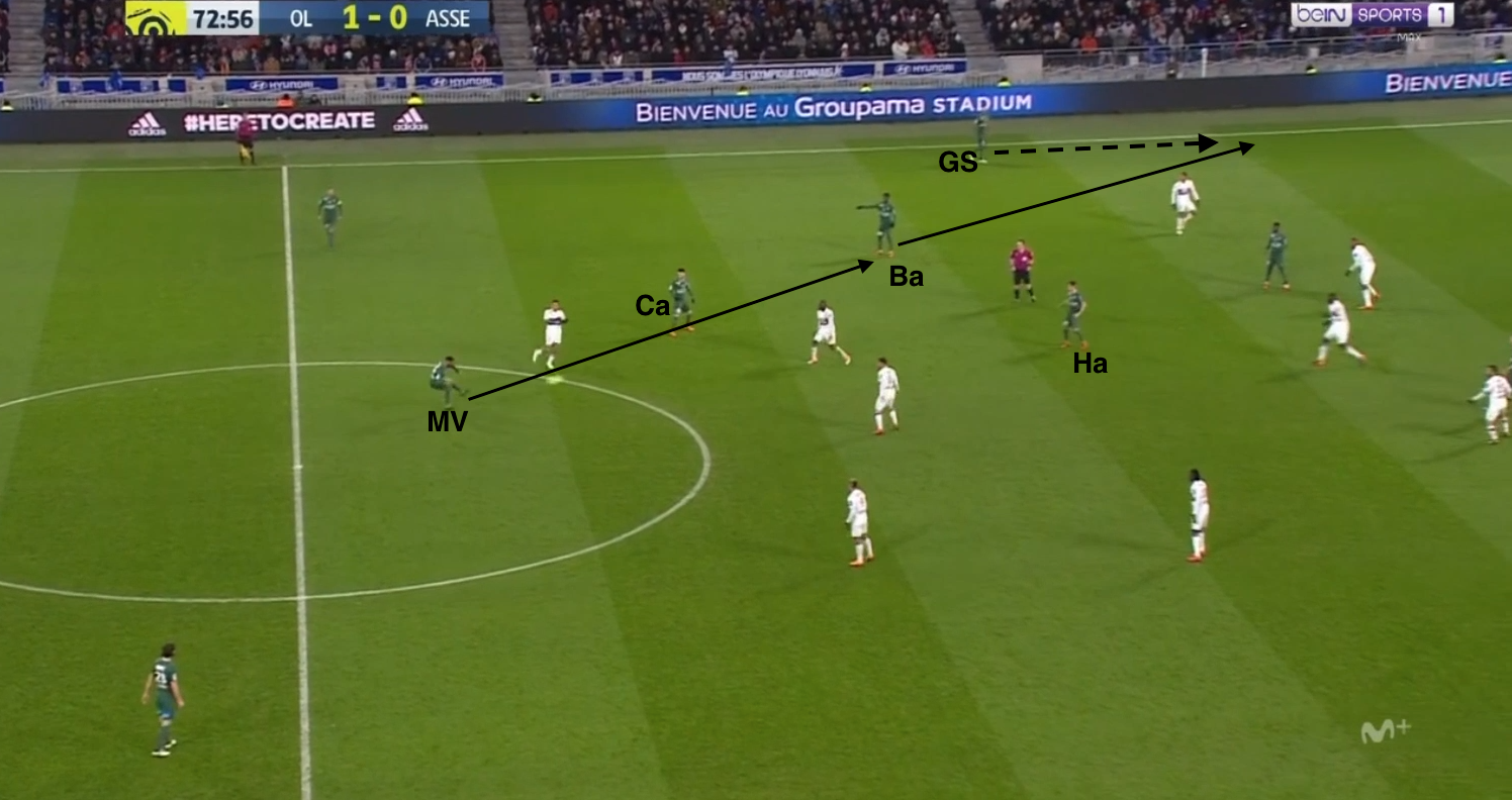 Les 5 défenseurs lyonnais sont alignés, 3 attaquants stéphanois s'y trouvent aussi, Bamba se place entre les lignes. Enfin, on peut difficilement parler de ligne des milieux adverses, ils ne sont pas bien placés, ils ne pressent pas et ils ne suivent pas non plus les appels en profondeurs des latéraux Verts. Sans être attaqué, M'Vila a donc tout le temps d'ajuster sa longue passe pour Diousse. Et au moment de la passe décisive de Cabella, il y a 6 Stéphanois dans la surface adverse...