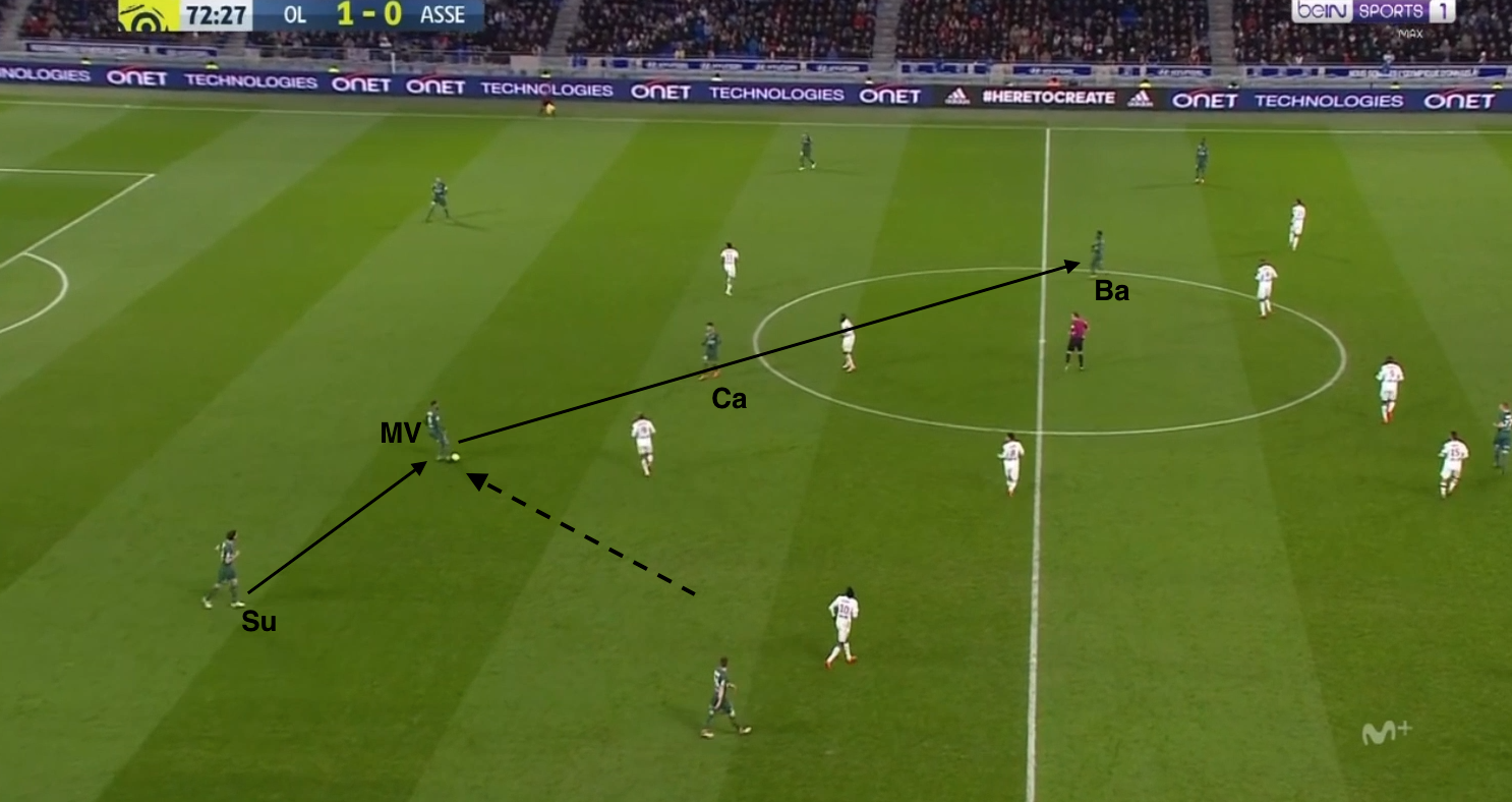 Sur cette image on voit bien le 5-4-1 adverse, ainsi que le 4-4-2 de l'ASSE, avec 4 éléments offensifs, deux latéraux qui montent, deux centraux qui s'écartent et deux milieux qui organisent le jeu dans l'axe. Les Verts continuent à faire tourner le ballon, avec Cabella qui le donne à M'Vila, qui s'appuie un Bamba qui a de nouveau décroché...