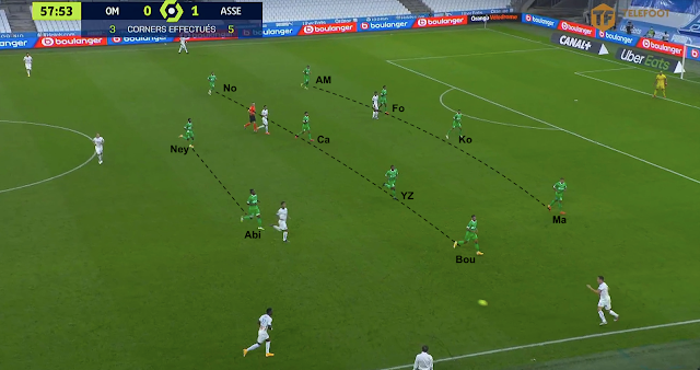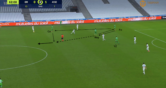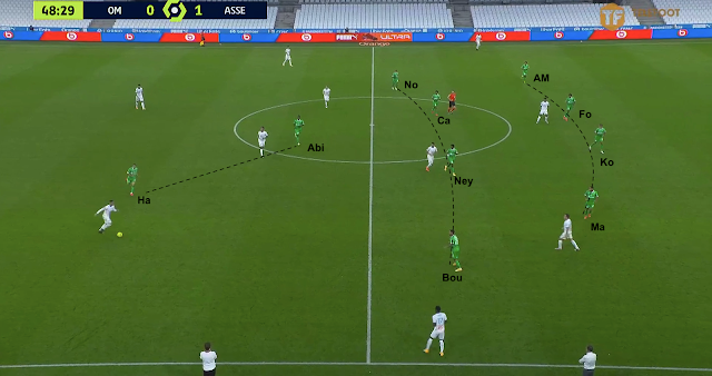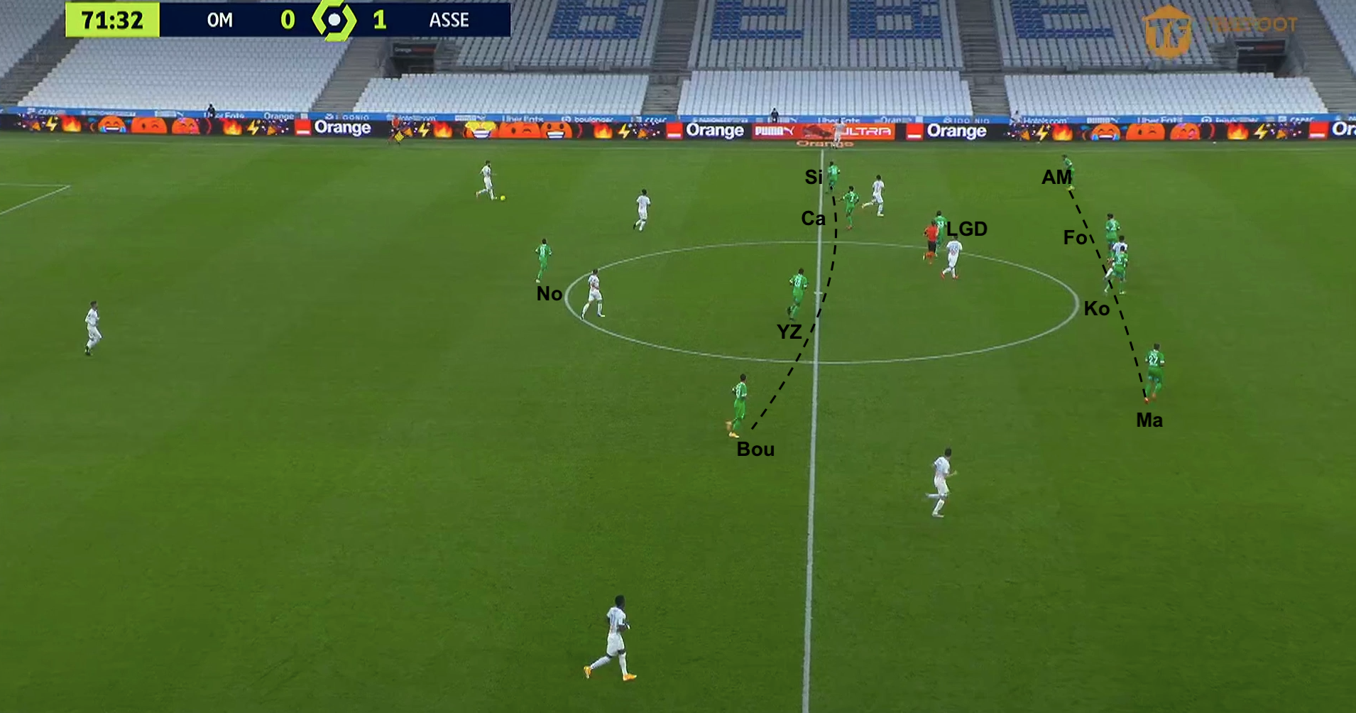Fofana et Kolo échangent des passes pendant que le pressing adverse se met en place et le premier joue en arrière avec son gardien. Les Stéphanois sont coupés en deux, les 4 offensifs (dont Neyou) sont dans la moitié adverse.