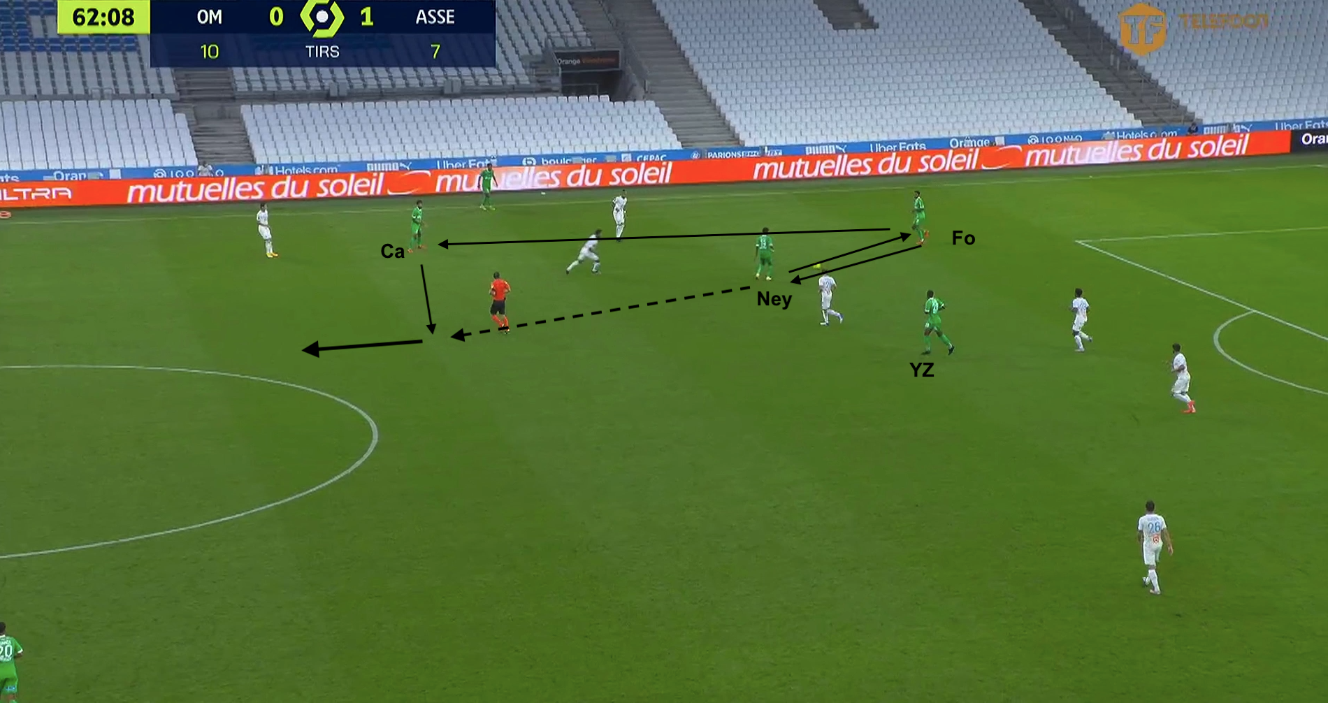Et après avoir joué avec les deux milieux, le jeune défenseur joue avec le troisième, Camara, qui trouve Neyou dans l'espace. Les Stéphanois se sont très bien sortis du pressing, ont gardé le ballon sans s'en débarrasser avec des longs dégagements et même si cette action ne donne rien à la fin, elle est un parfait exemple du changement dans le jeu.