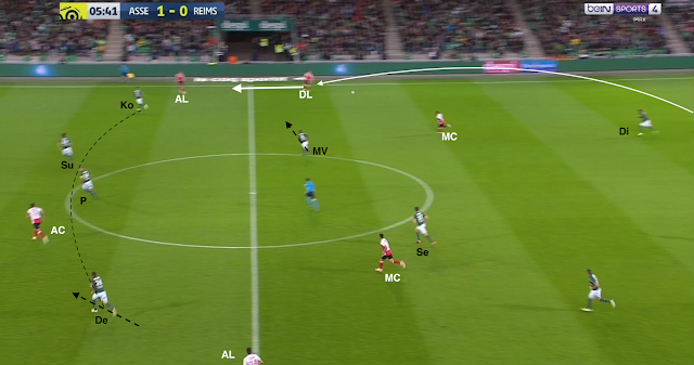 Les Verts aiment construire leurs attaques en partant de derrière et les adversaires le savent. Dans cet exemple qui commence à la 9e, M'Vila joue en retrait avec Subotic, qui passe à Perrin :