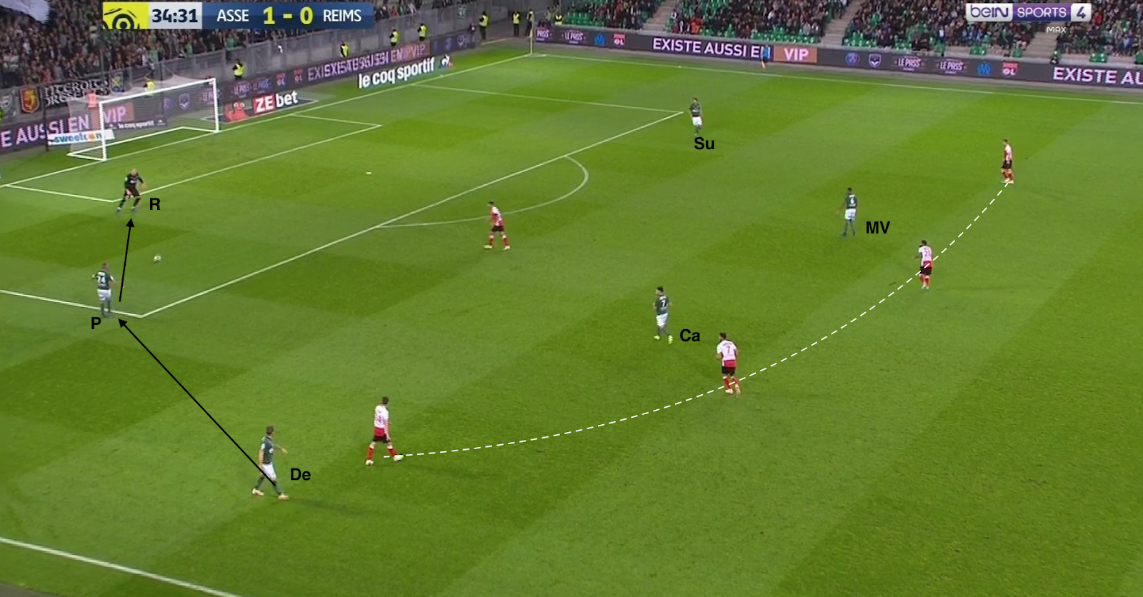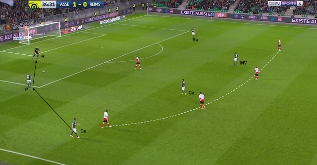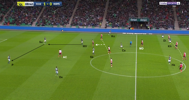 Perrin reçoit de nouveau le ballon. L'angle de passe vers Debuchy est bouché par le milieu adverse et celui vers Subotic par l'avant-centre. M'Vila est surveillé par deux adversaires, pendant que Cabella est suivi par un autre. Mais Perrin lui fait confiance et lui donne le ballon - une feinte de passe vers Debuchy envoie le milieu axial rémois vers le côté et le numéro 7 stéphanois peut se retourner tranquille, les Verts se sortent du pressing :