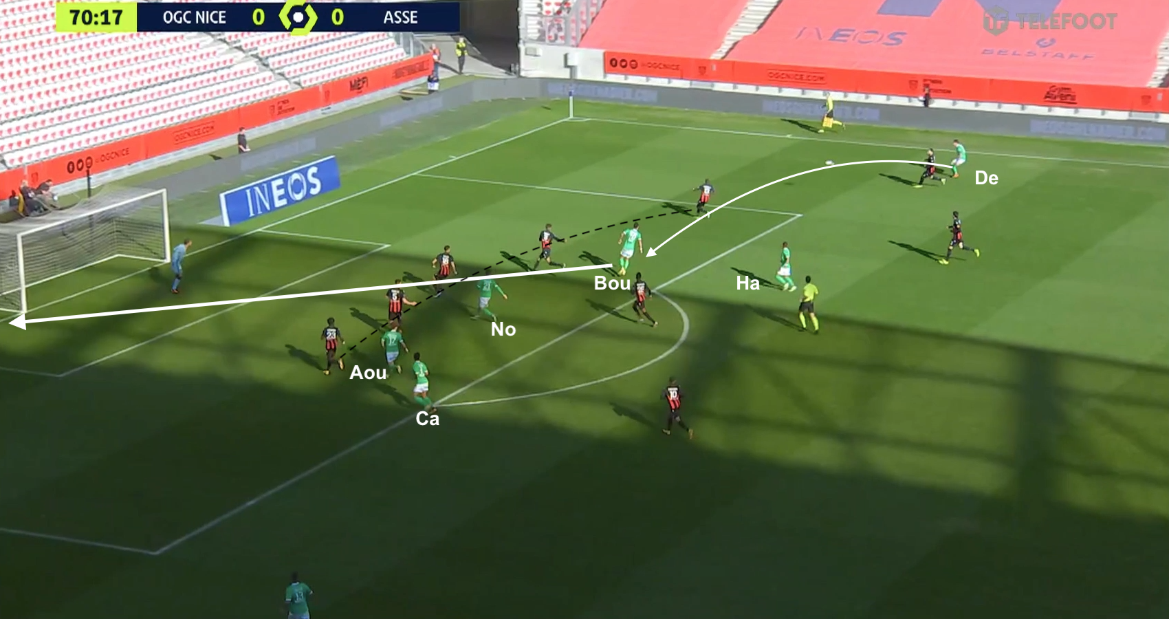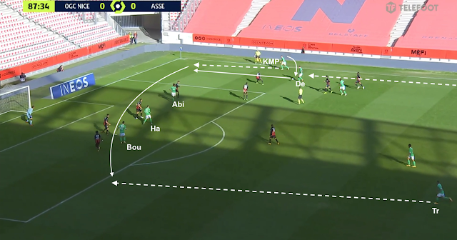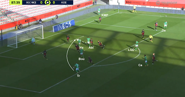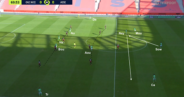 Nice a continué d'utiliser ce système ultra-défensif après la pause, abandonnant la maîtrise du jeu aux Stéphanois, se contentant de quelques contres et des coups francs. Ça a été donc un peu plus dur pour les Verts, qui se sont néanmoins procurés d'autres occasions, comme dans cet exemple à la 70e :