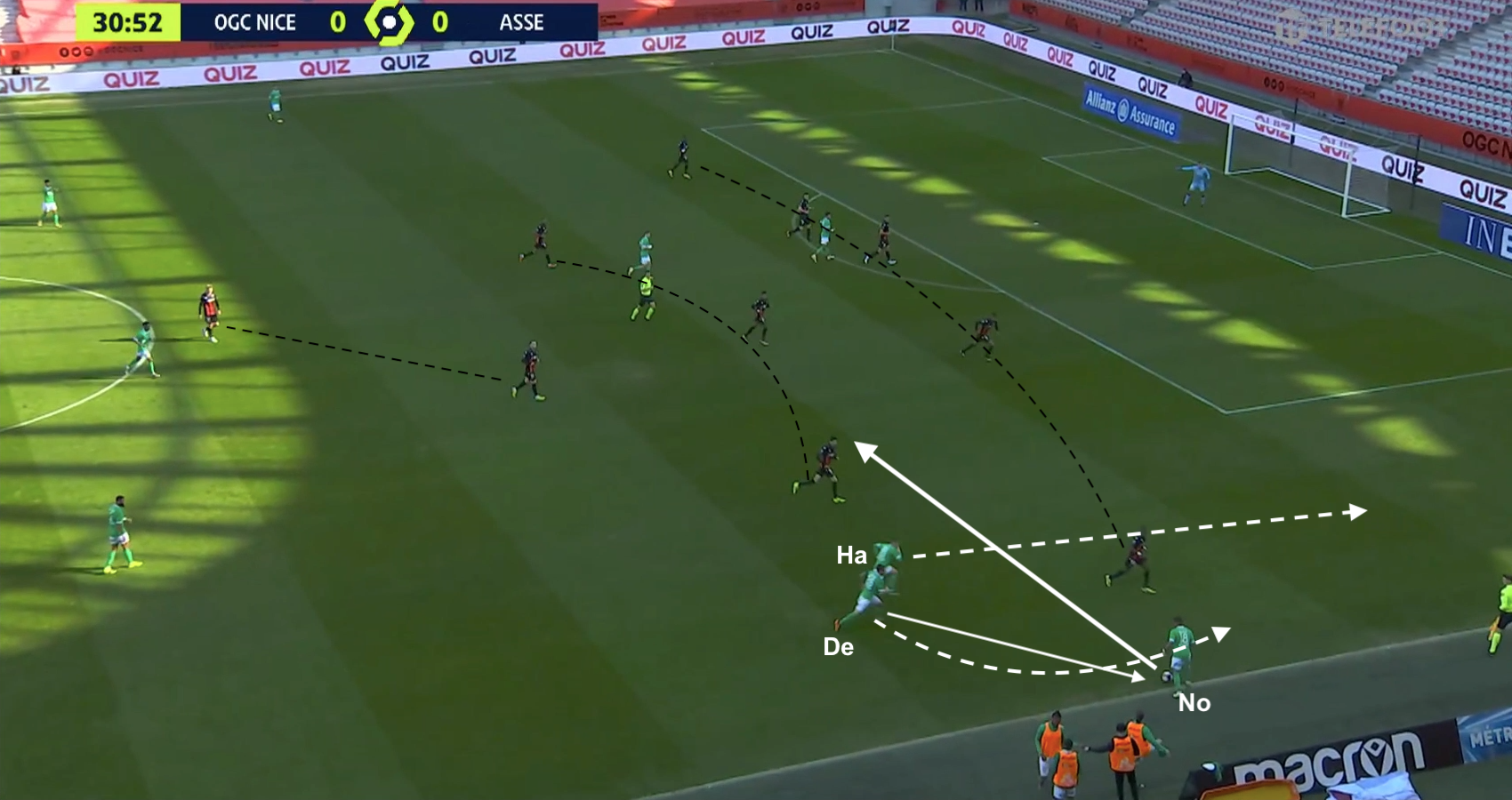 Les Niçois ont tellement été baladés de gauche à droite lors des attaques stéphanoises, que leur entraîneur a dû procéder à un ajustement tactique avant même la mi-temps :