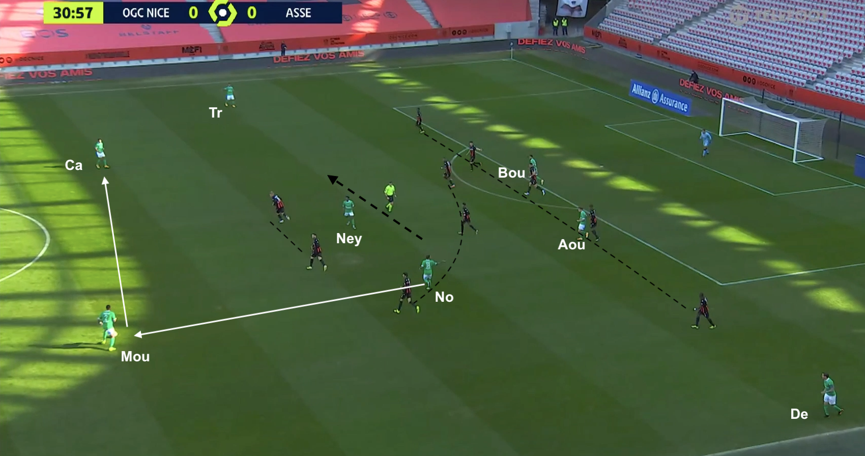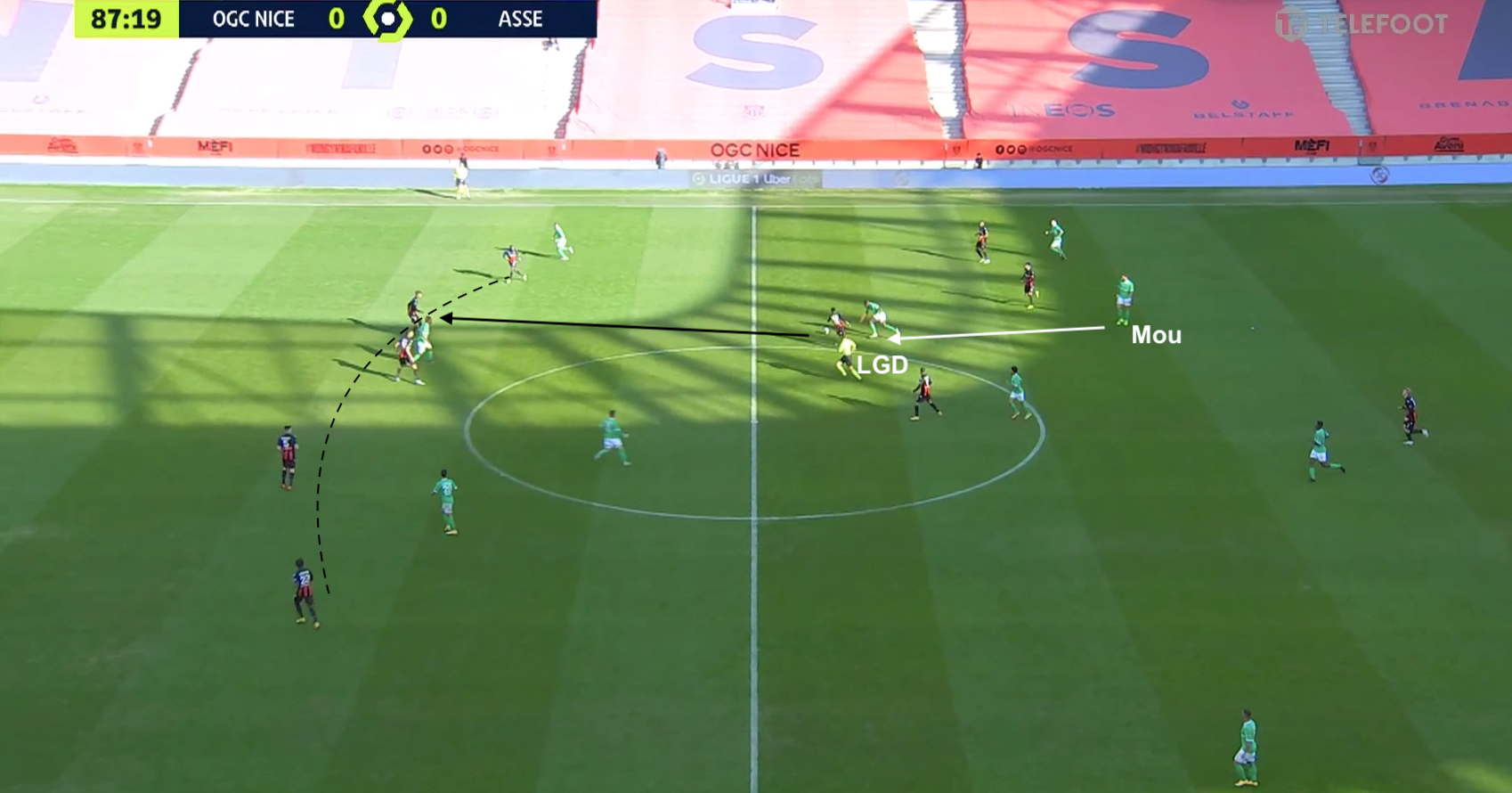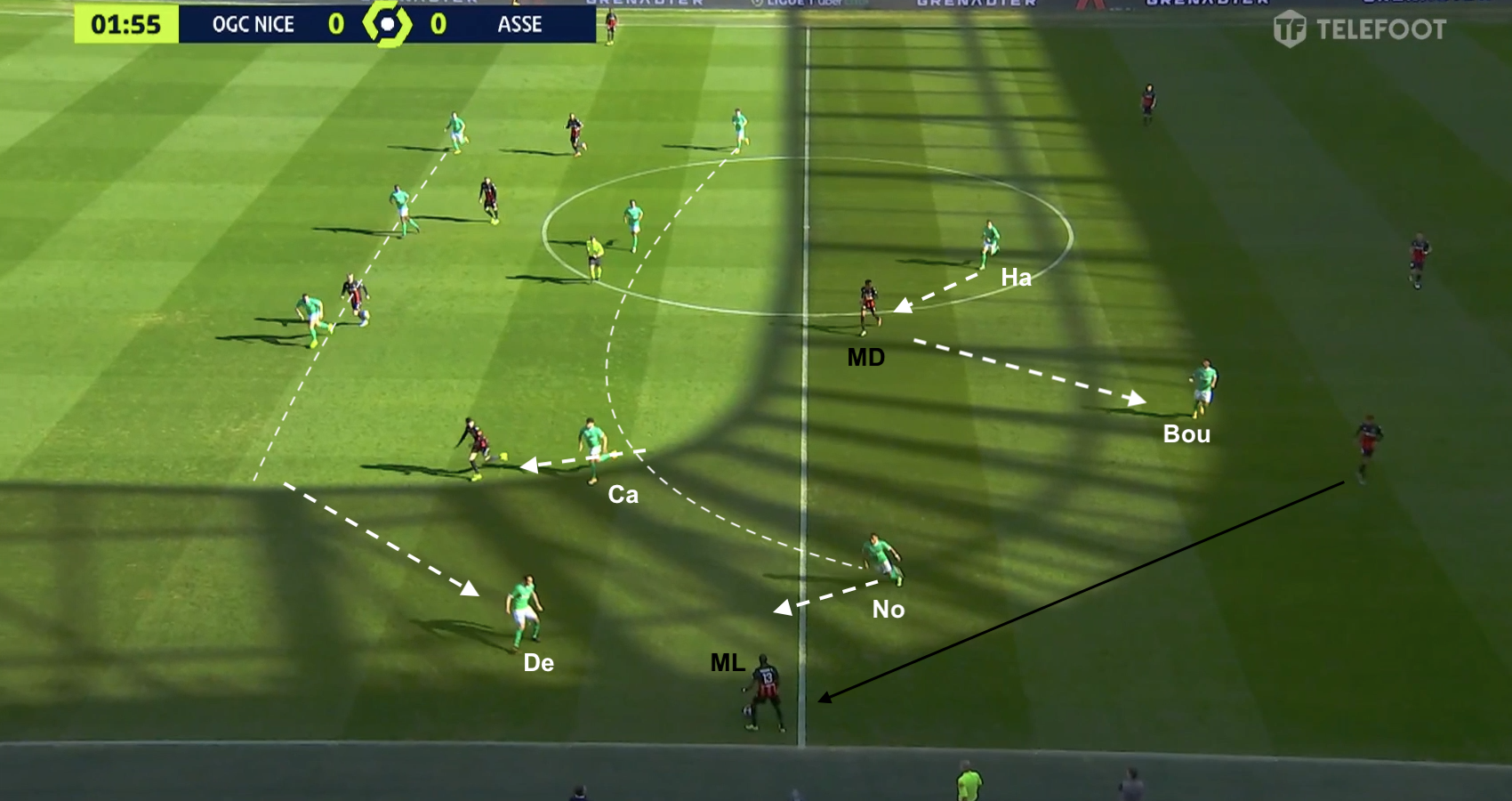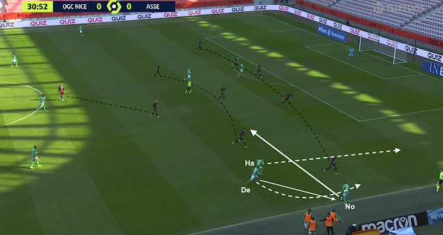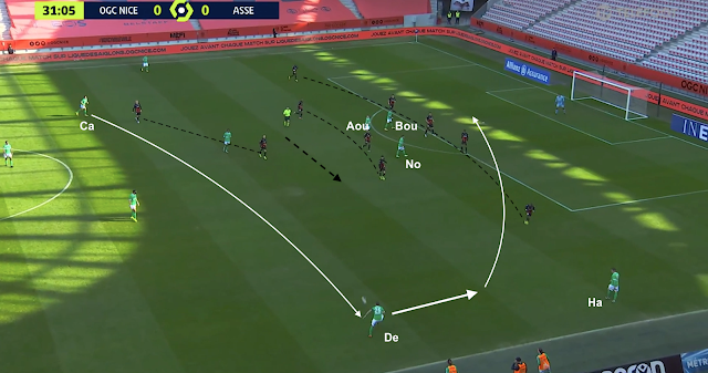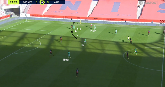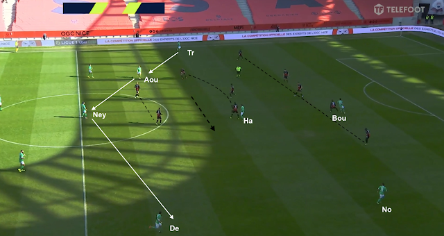 Pour le reste, un 4-4-2 plutôt classique, où les 4 éléments offensifs ont eu un rôle défensif important contre le 3-5-2 niçois. Hamouma et Bouanga se sont relayés pour être au marquage de la sentinelle adverse et de presser les défenseurs. Le ballon circulait entre les 3 défenseurs centraux : quand il allait à droite, l'attaquant de ce côté (Hamouma dans l'image ci-dessus) allait vers le défenseur et l'autre (Bouanga) vers le milieu défensif. Et quand le ballon était envoyé dans l'autre direction, ils changeaient :