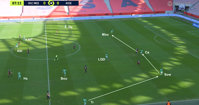 ... mais il y a du monde dans le couloir. Le piston sort sur Trauco, un milieu suit Aouchiche et un autre bloque Camara. Les Verts arrivent quand-même à combiner et Trauco ressort le ballon pour Sow. Pendant ce temps, le milieu latéral gauche de Nice est resté dans la zone de Debuchy, qui n'est plus si libre comme avant. Quand le jeu est envoyé vers la droite...
