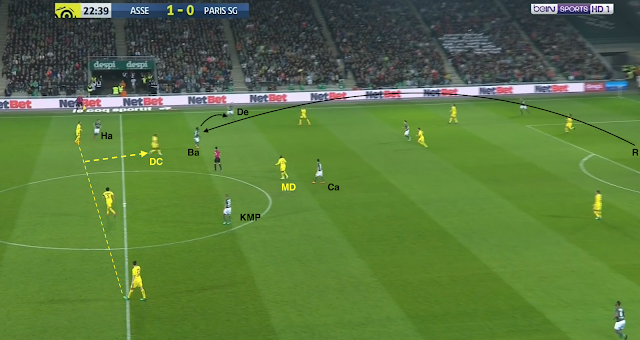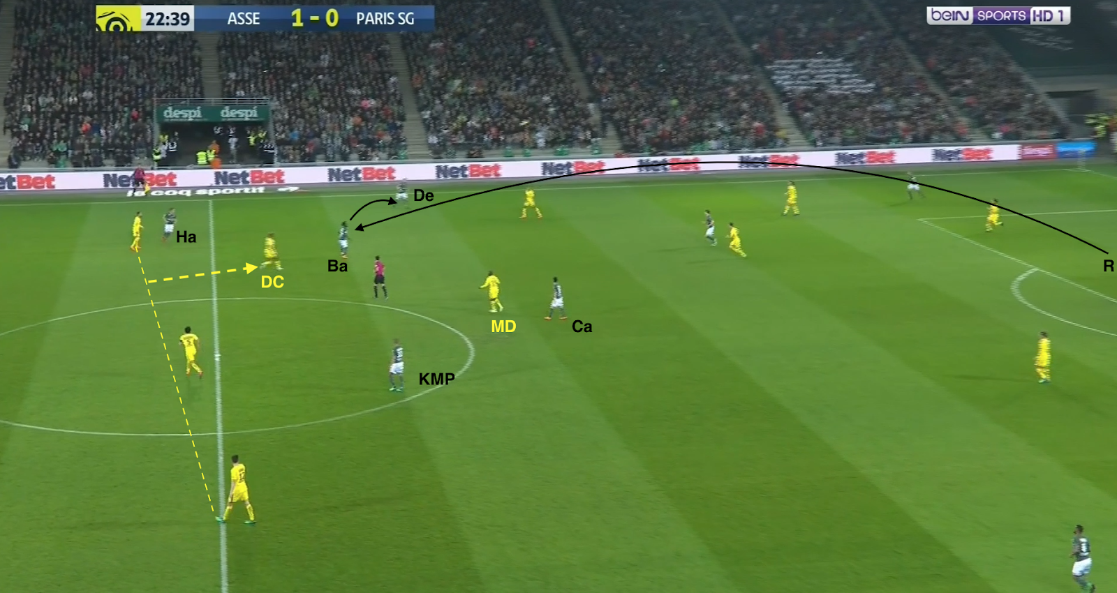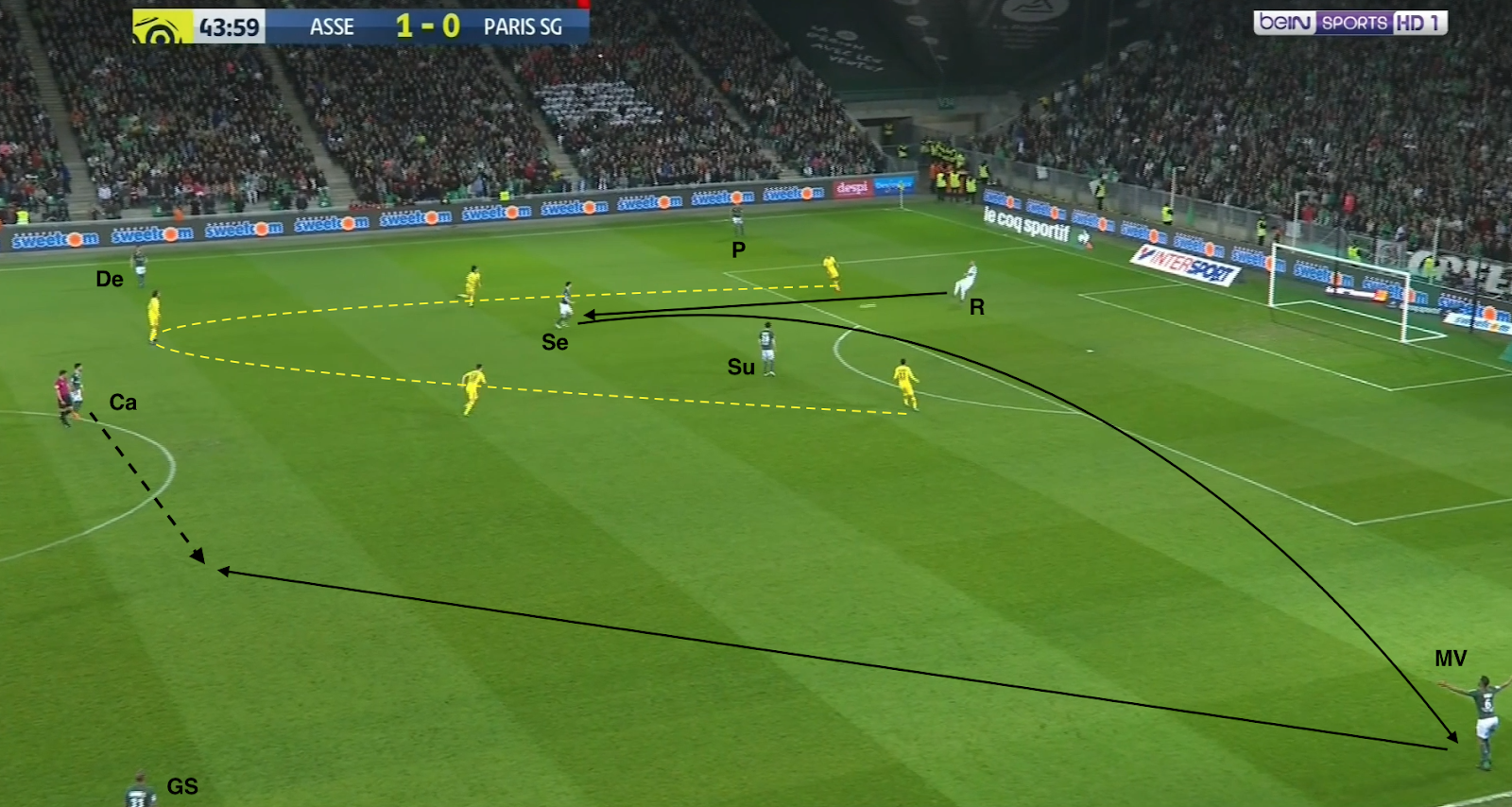 Les 5 Parisiens (tous sauf les 4 défenseurs) essayent d'enfermer les Stéphanois, pendant que M'Vila, complètement seul sur son côté gauche, fait des grands gestes pour demander le ballon. Il le reçoit via Selnaes, servi par Ruffier malgré le pressing adverse, et le donne ensuite à Cabella. Les Verts ont un grand espace à leur disposition et ils en profitent :