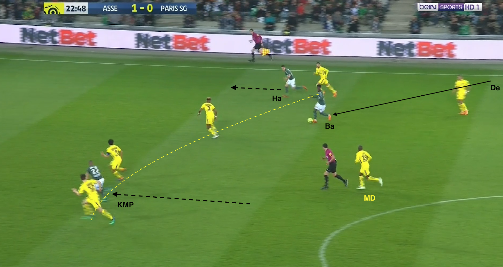 Il y avait un tel espace entre les lignes parisiennes, que le jeune Stéphanois n'a aucun problème à réceptionner la longue passe - un défenseur pense à le chercher, mais il part de loin et arrive trop tard, Bamba combine avec Debuchy...