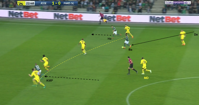 Cabella, suivi toujours de près par la sentinelle adverse, décroche pour échanger des passes avec son capitaine. Ça a le don d'attirer les Parisiens, qui se retrouvent à 6 dans les 30 mètres stéphanois (laissant donc les 4 défenseurs sur la ligne médiane), en train de presser. Et comme dans l'exemple précédent, M'Vila se retrouve en latéral gauche, tout seul, faisant des grands gestes pour avoir le ballon pendant quelques secondes. KMP est complètement libre dans l'axe et Gabriel Silva - pas sur l'image - apporte un surnombre encore plus important dans ce grand espace à gauche.