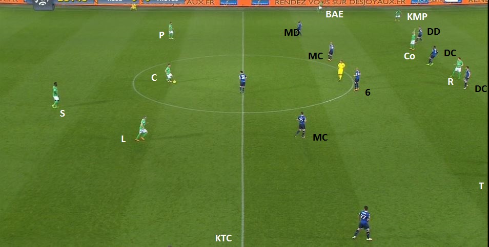 S'il existe plein de variations à cette tactique, analysons-en une qui a été souvent utilisée par les Verts contre Troyes. Comme les deux milieux centraux (Cohade et Lemoine dans ce cas) ne peuvent pas être facilement trouvés dans le bloc troyen, ils bougent. L'un (souvent Cohade) monte très haut, au niveau des attaquants, pendant que l'autre descend au niveau de la sentinelle :