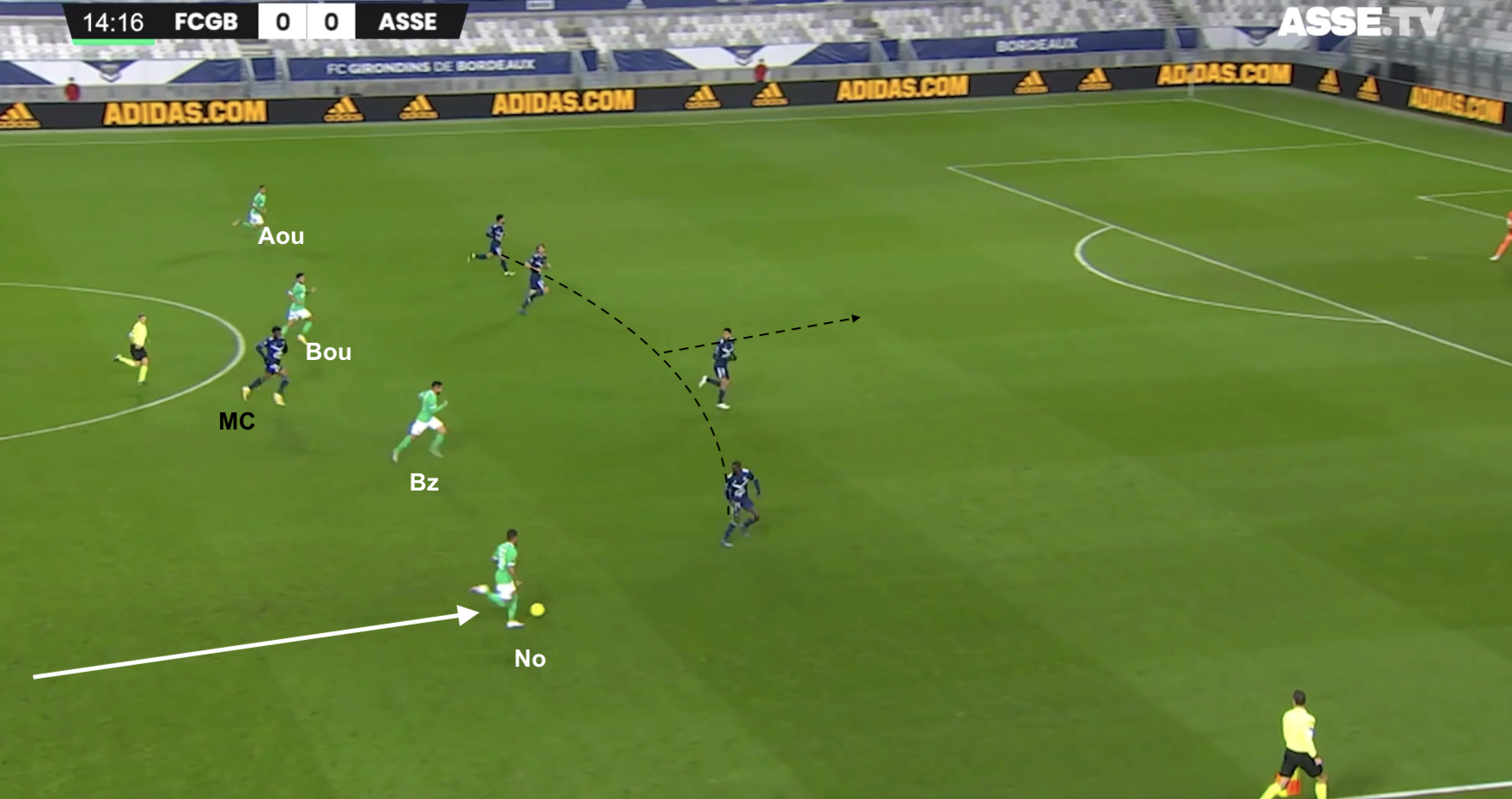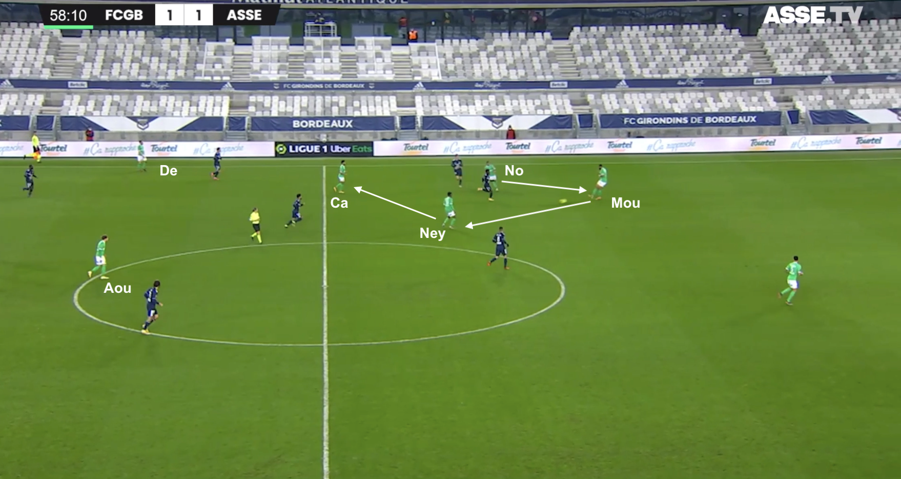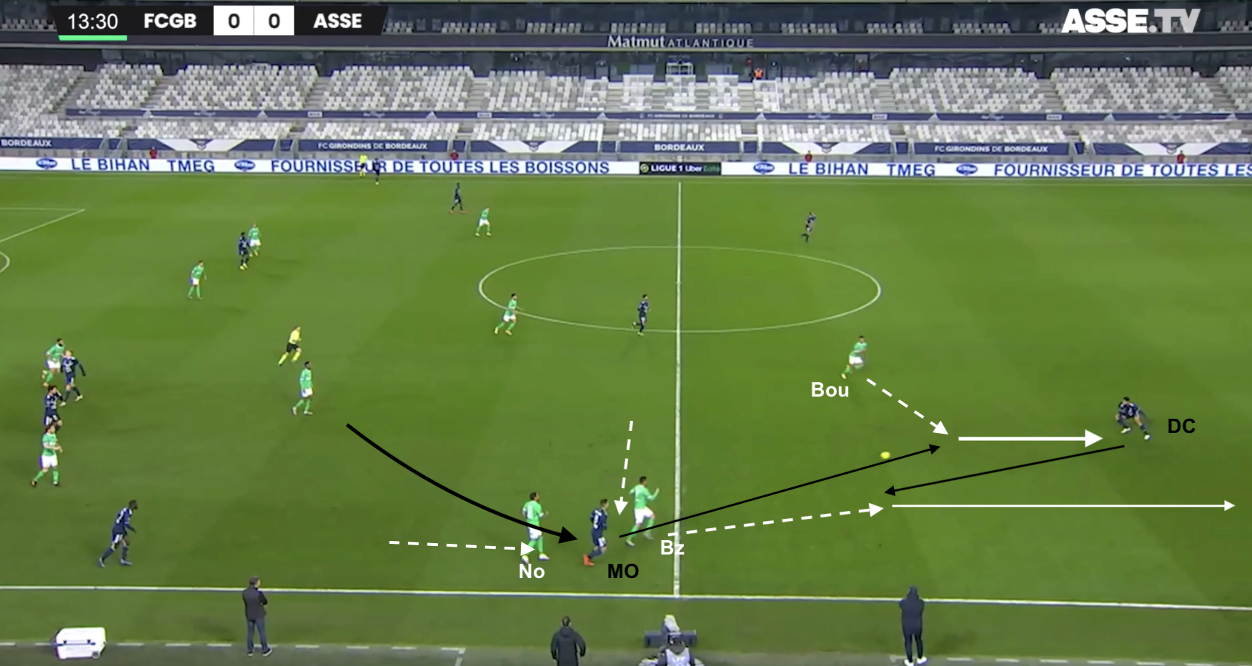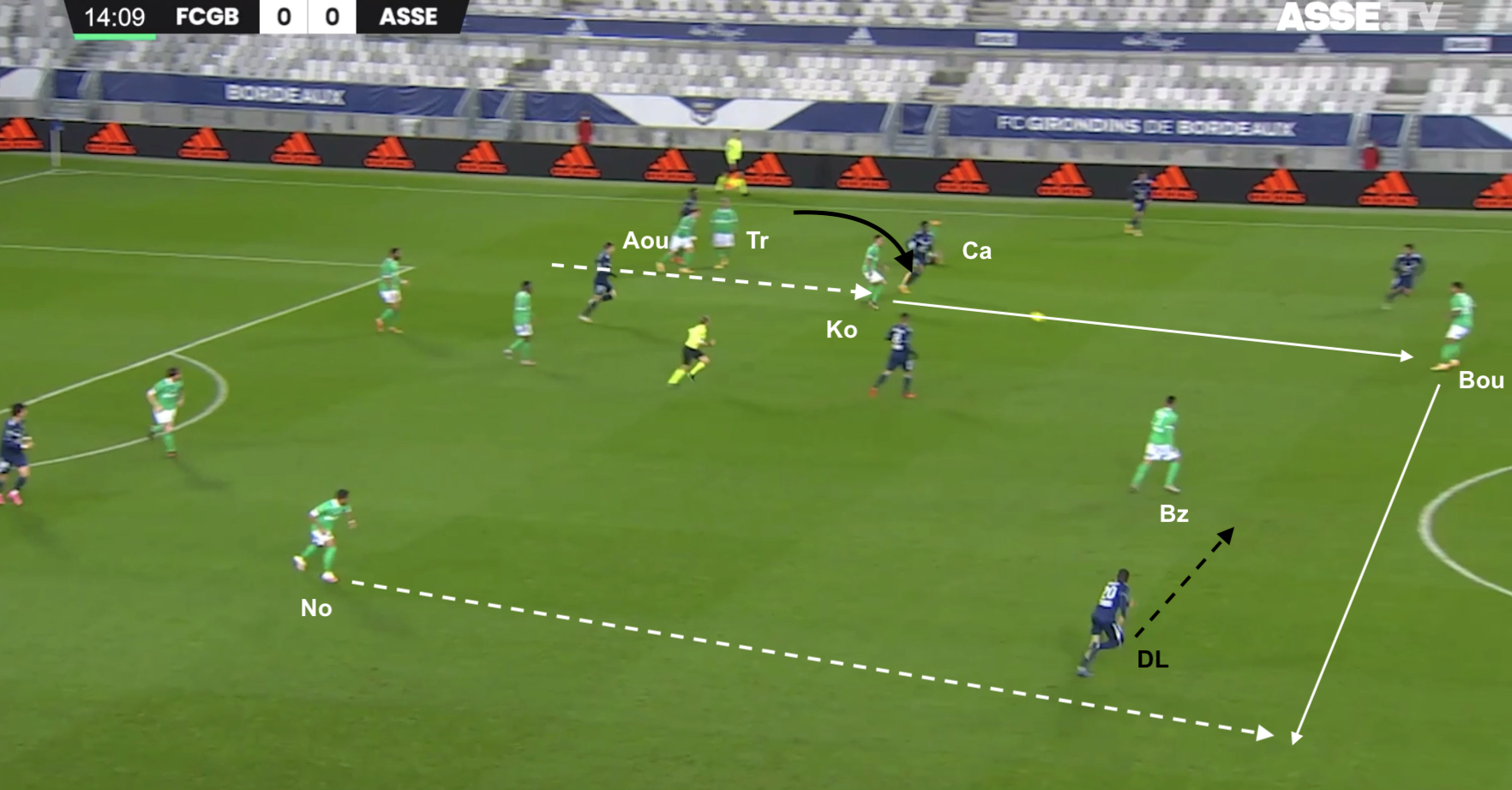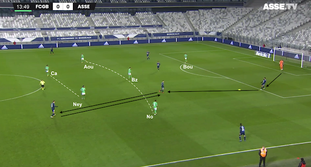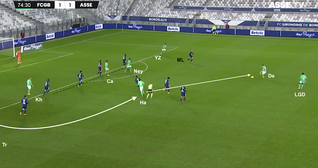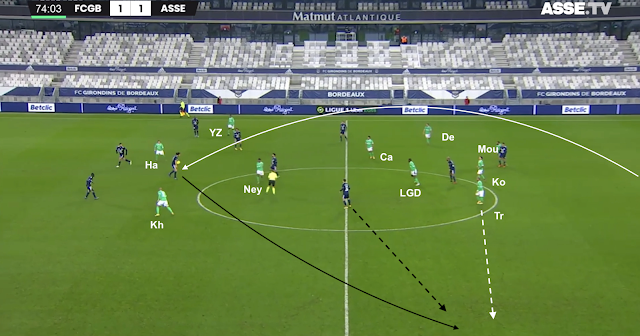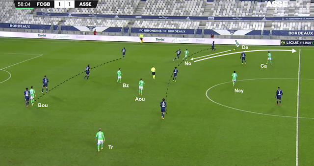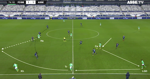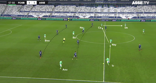 Un changement de physionomie a été clairement visible dès le retour des vestiaires, quand les Bordelais n'ont pas vu le ballon pendant plusieurs minutes. Les Verts se sont procurés moins d'occasions franches que les face-à-face de Bouanga en 1MT, mais ils ont globalement maîtrisé les débats. Plus frais que leurs adversaires, ils ont beaucoup dézoné pour créer des décalages, comme dans cet exemple à la 58e :