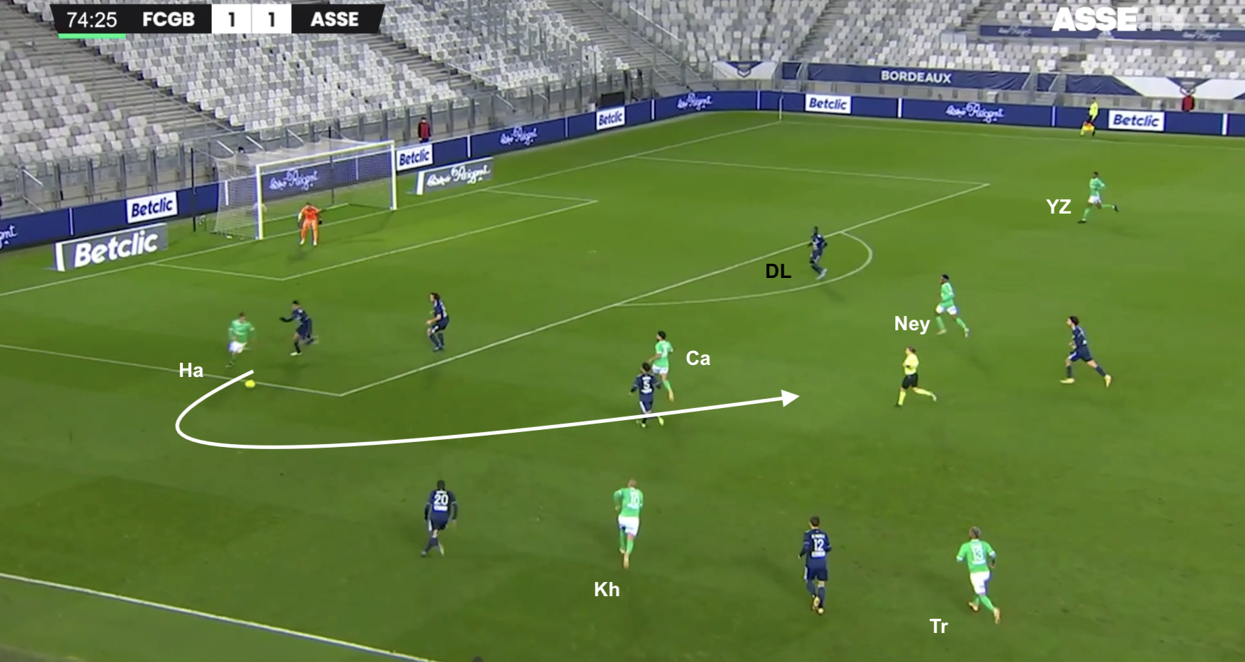 ... et sur cette image on voit tous les Stéphanois regroupés à droite. Bouanga fait un appel qui resserre encore plus la défense, ce qui libère plus d'espace pour...